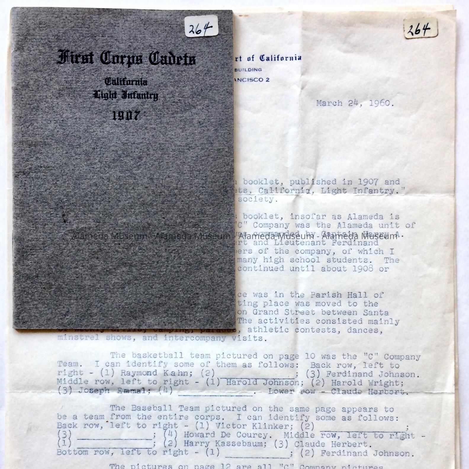 DESCRIPTION: AN ILLUSTRATED SOFT-COVER BOOKLET. BOOKLET HAS A BOLD-PRINTED CAPTION, "FIRST CORPS CADETS," IN DARK BLUE-COLORED TYPE ON A GREY-COLORED BACKGROUND. ATTACHED IS A TWO-PAGE TYPEWRITTEN LETTER, WHICH BEARS A CAPTION, "SUPREME COURT OF CALIFORNIA, STATE BUILDING, SAN FRANCISCO."