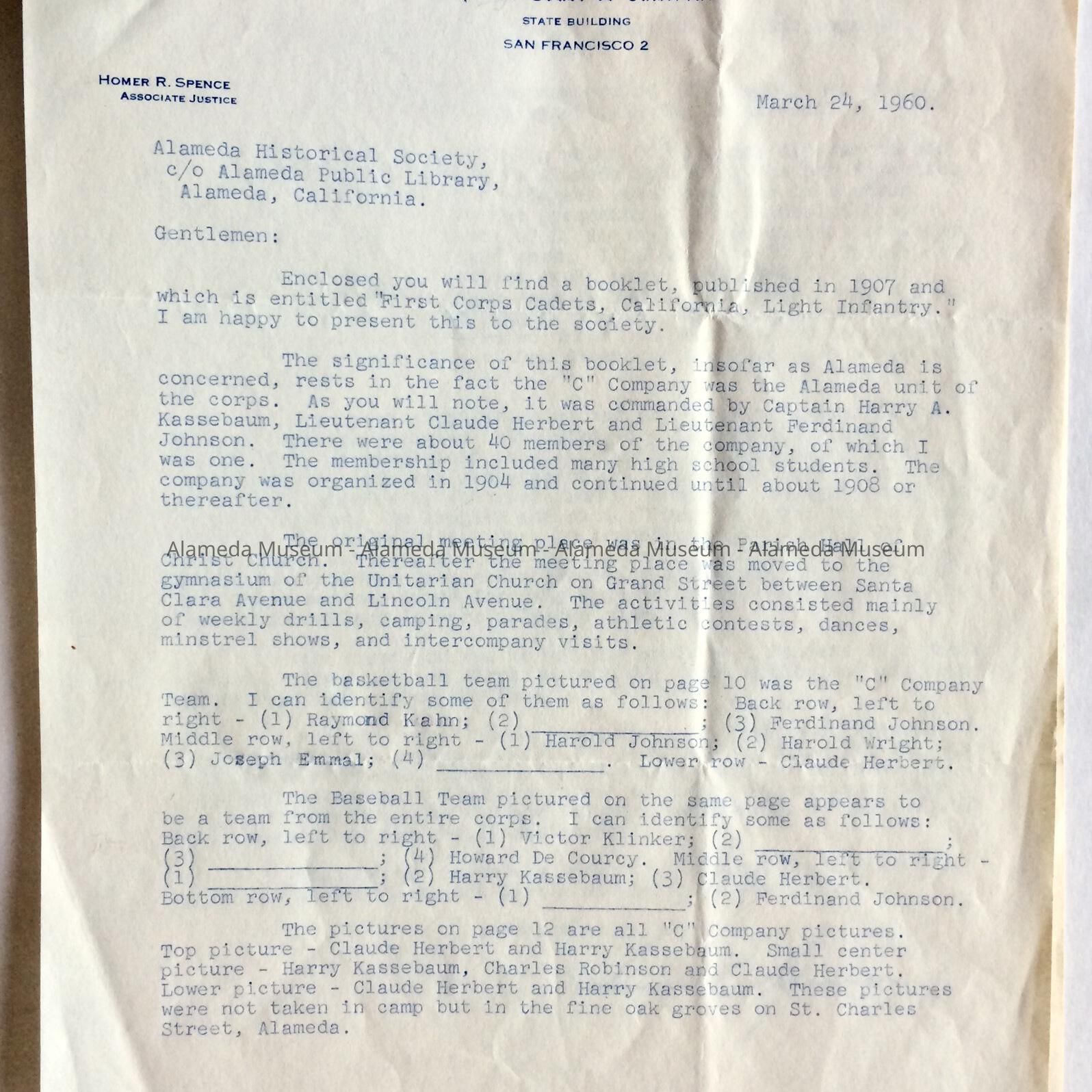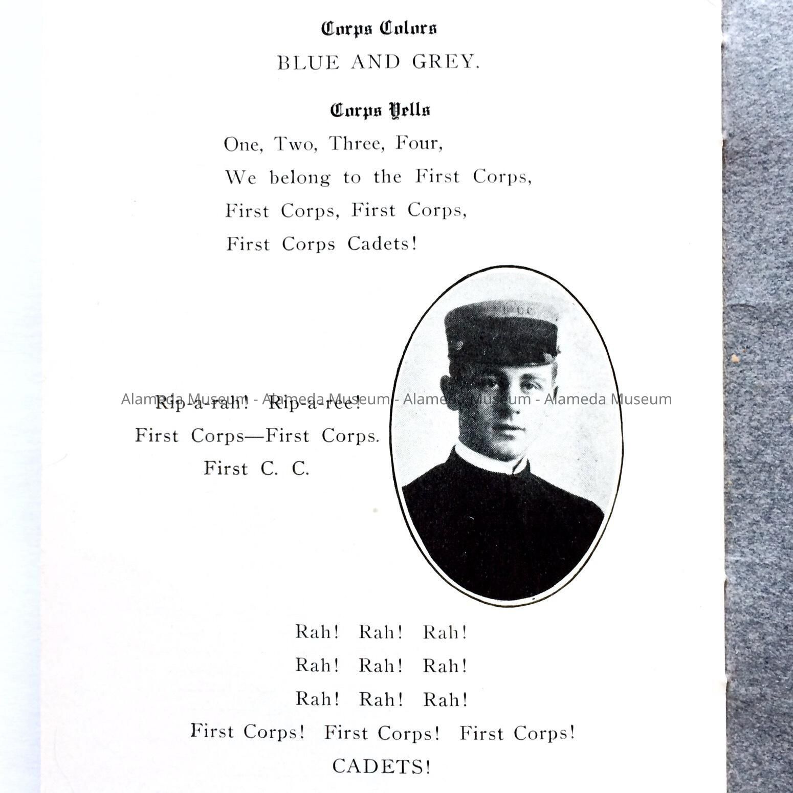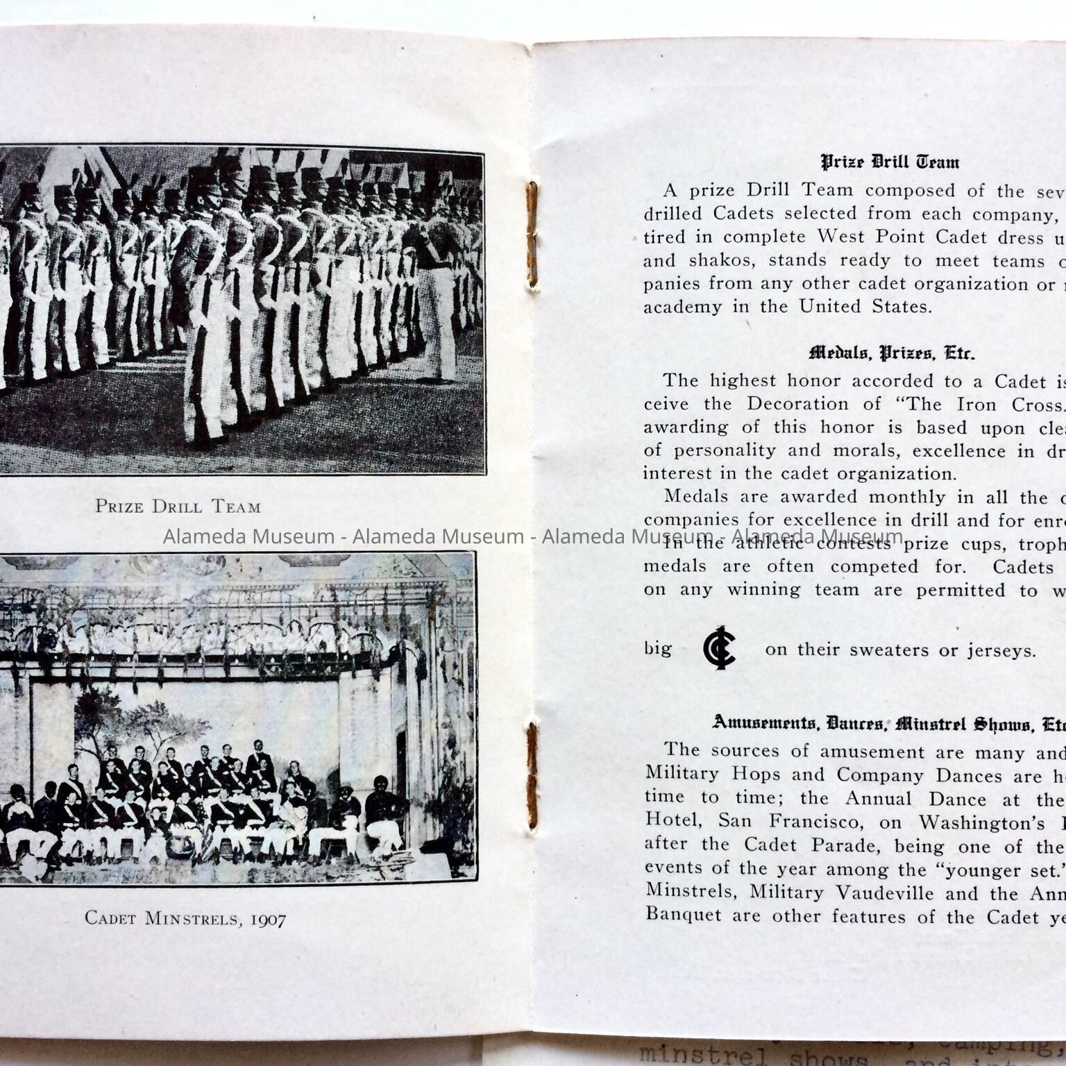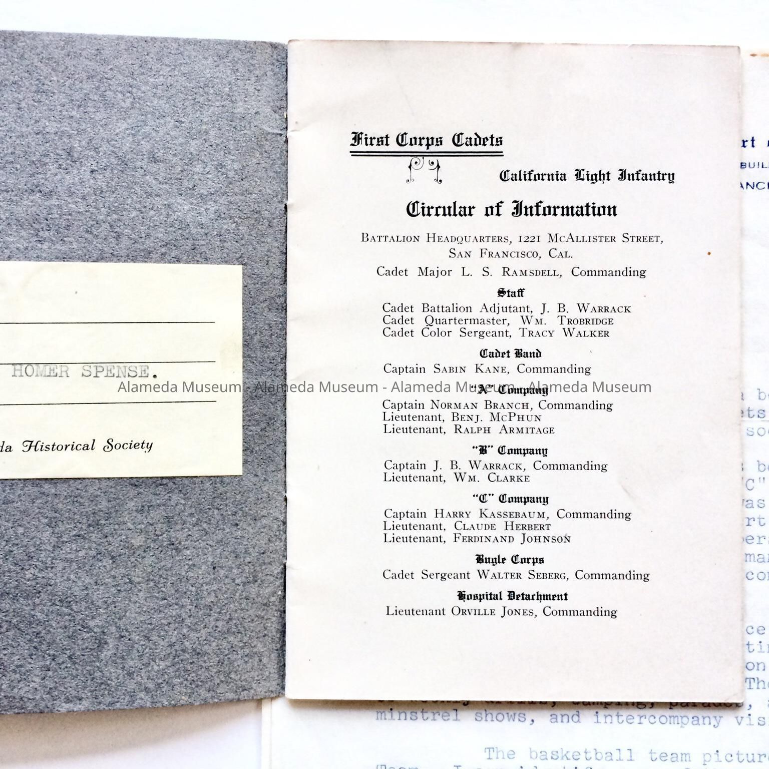 HISTORY OF OBJECTS: ILLUSTRATED BOOKLET CONCERNING THE FIRST CORPS CADETS, CALIFORNIA, LIGHT INFANTRY, 1907, COMPANY "C" OF THE CADETS; FORMED IN ALAMEDA IN 1904. THE DONOR WAS A MEMBER AND A LONG-TIME RESIDENT OF ALAMEDA. JUDGE SPENCE WAS ALSO ACTIVE IN THE ALAMEDA HISTORICAL SOCIETY AT ITS INCEPTION.