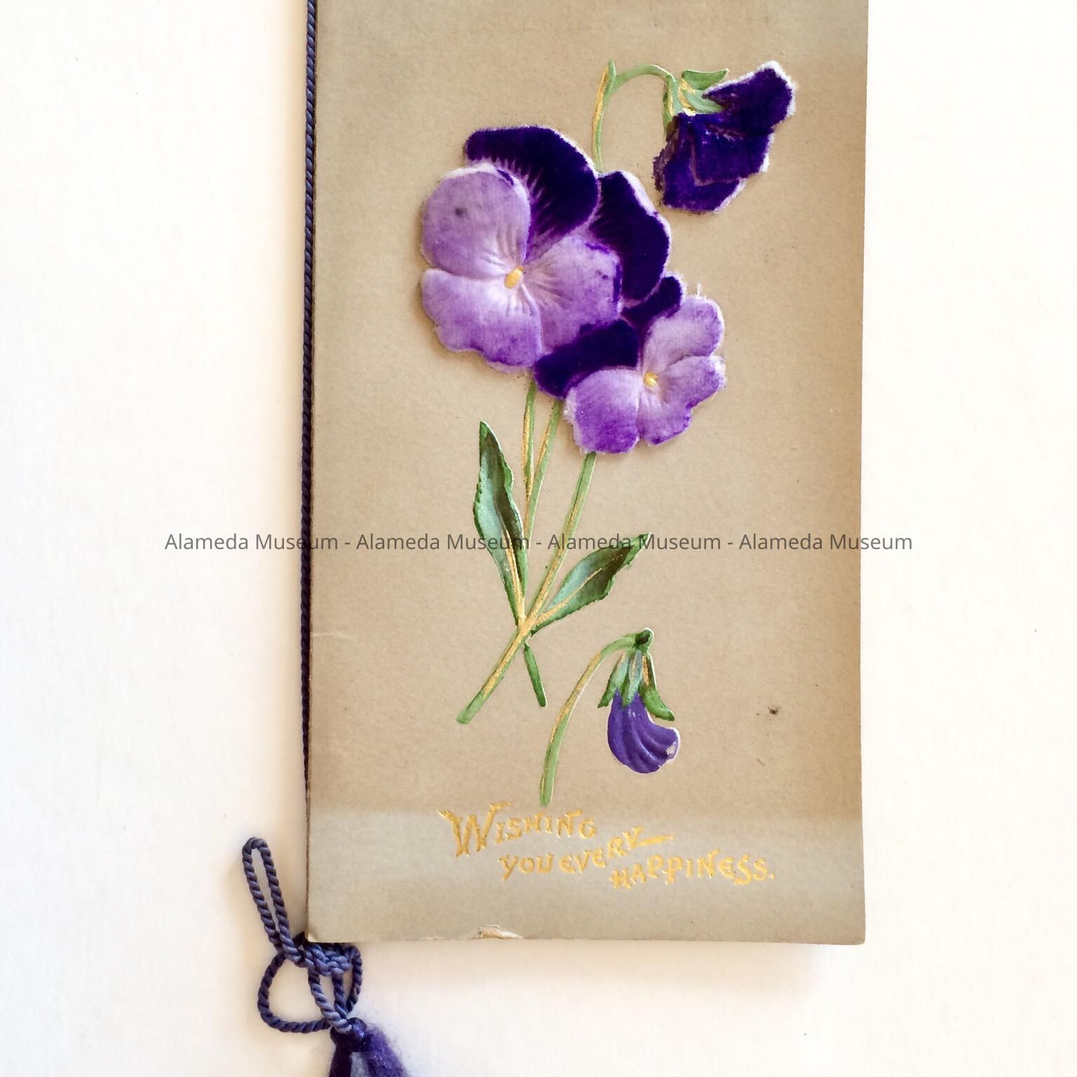 Booklet greeting card with embossed pansies, sent to Ms. Elvah Sinnett, early 1900sEntry/Object ID