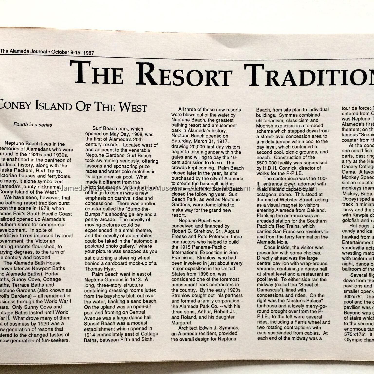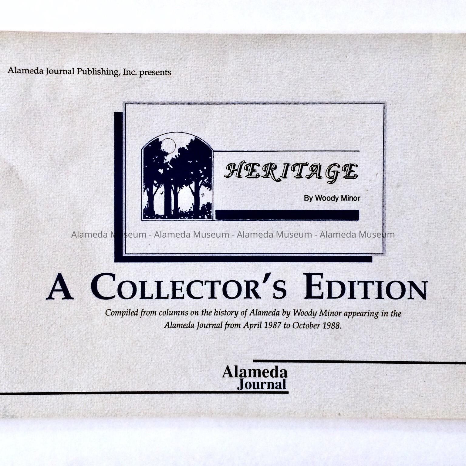 A BOOKLET ENTITLED, "HERITAGE - A COLLECTOR'S EDUCATION," AUTHORED BY WOODY MINOR. A COMPILATION OF ARTICLES WOODY HAD WRITTEN ON THE HISTORY OF ALAMEDA, AND WHICH APPEARED IN THE ALAMEDA JOURNAL FROM APRIL 1987 TO OCTOBER 1988. SOME OF THE ARTICLES REFERRED TO HENRY H MEYERS, ARCHITECT, NEPTUNE BEACH, THE POLITICAL PROBLEMS UNDER THE ADMINISTRATION OF B RAY FRITZ IN THE 1930'S, ETC.