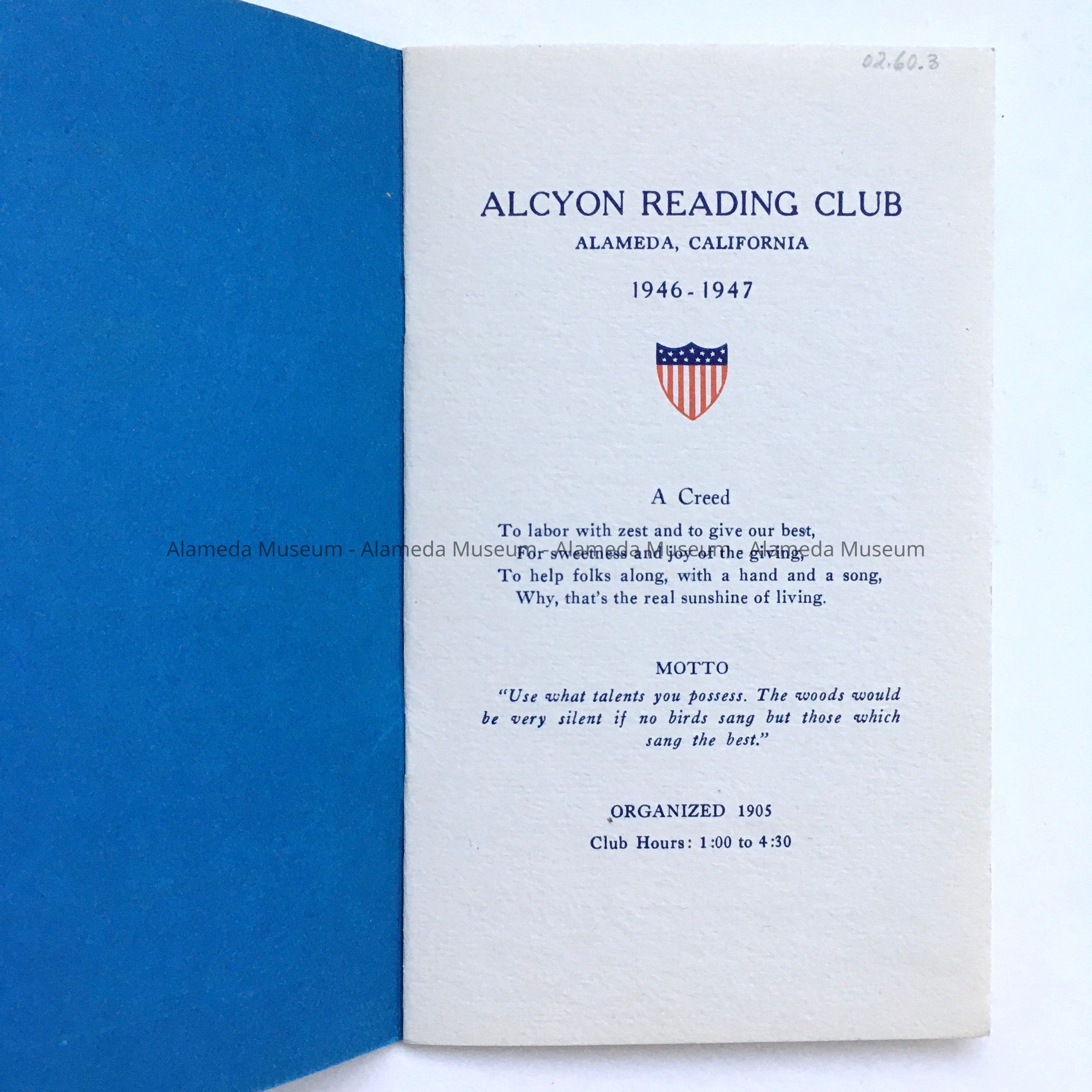 A SOFT-BOUND BOOKLET. COVER HAS BOLD-PRINTED CAPTION, "ALCYON READING CLUB," IN BLUE-COLORED TYPE ON A BLUE COLORED BACKGROUND.