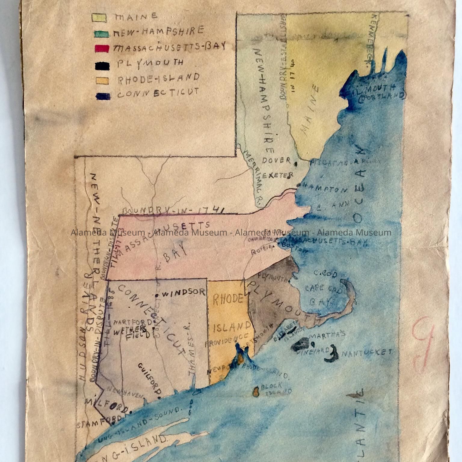 History of Object: Maps of the New England Colonies, drawn by Leonora Crutchett (possibly a class assignment), Haight School, Alameda, dated May 26, 1911.