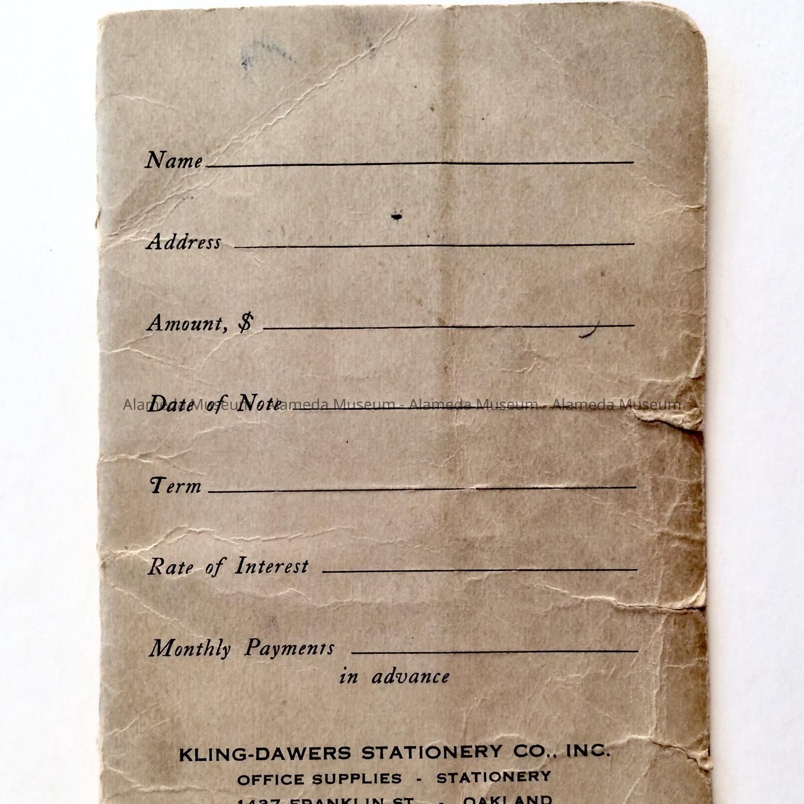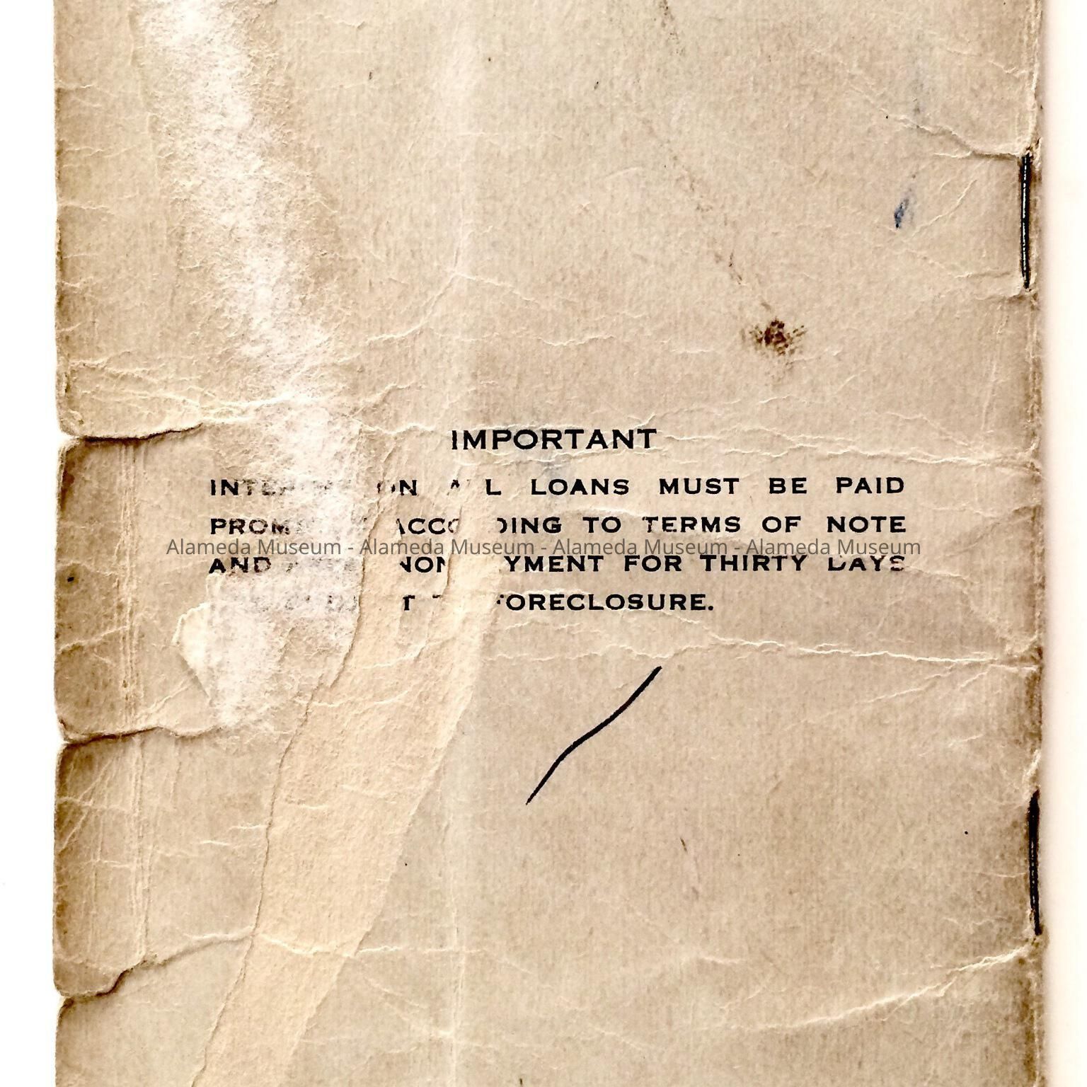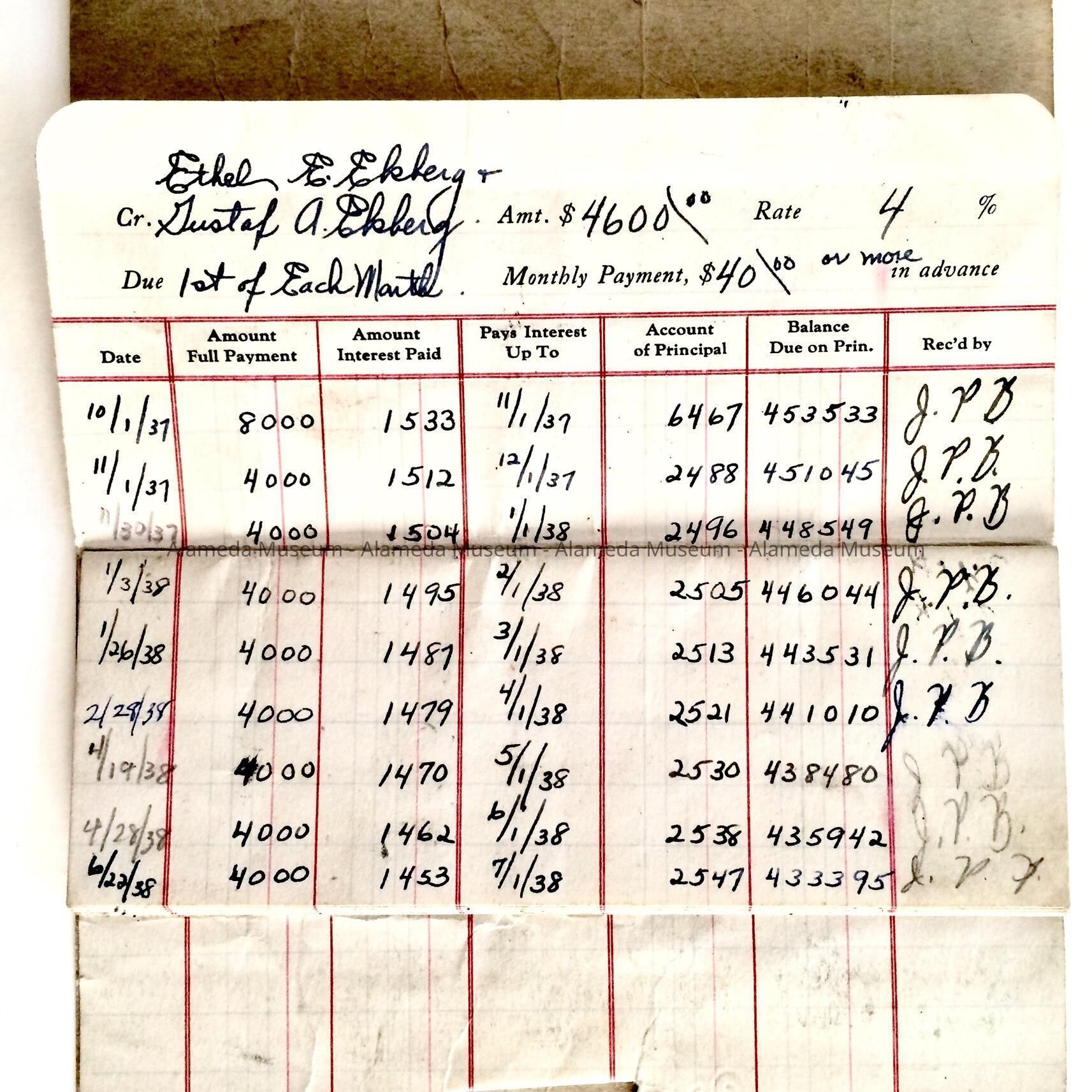 History of Object: ENTRY BOOKLET WHERE MONTHLY PAYMENTS WERE RECORDED IN THE HOME OF GUSTAF AND ETHEL EKBERG, 3333 FERNSIDE BLVD, ALAMEDA.