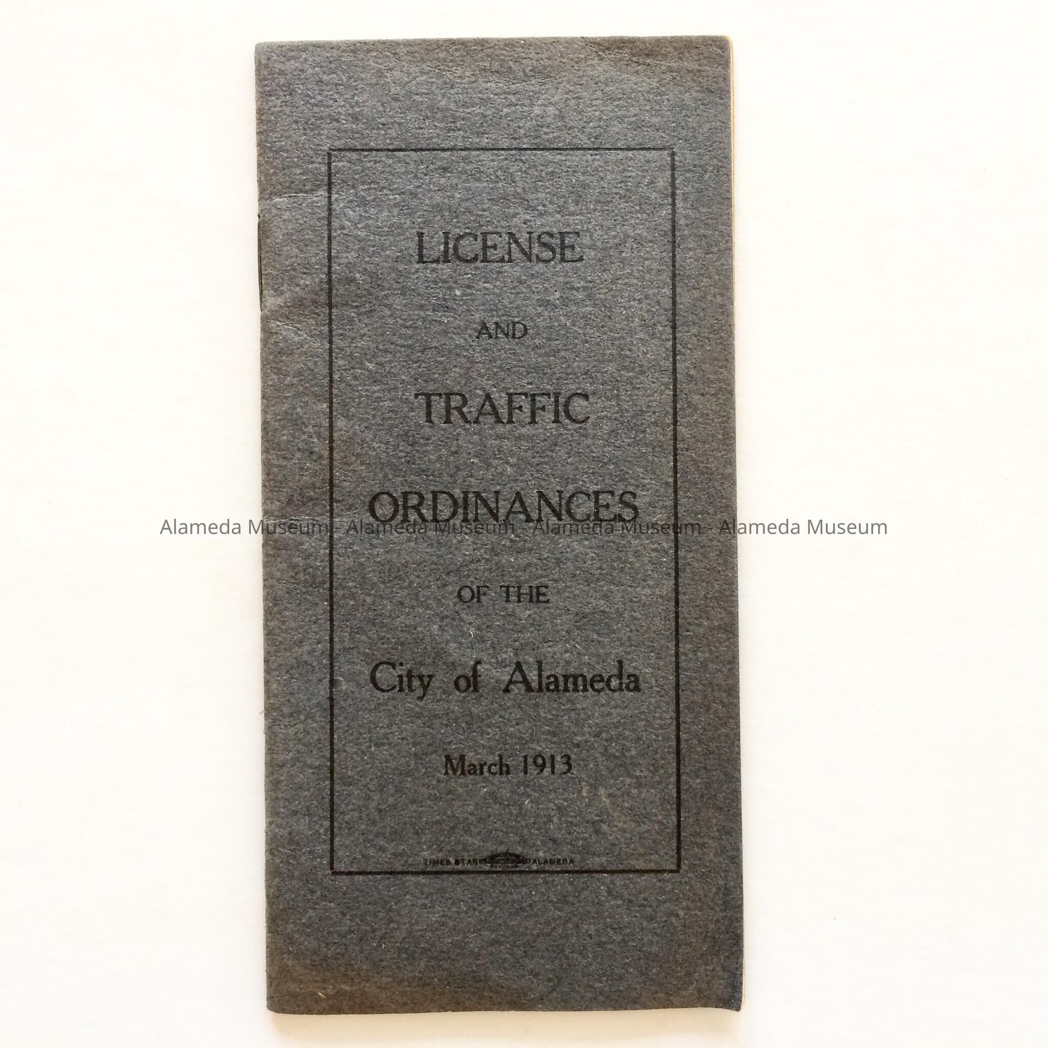 History of Object: Booklet containing license and traffic ordinances of the City of Alameda, dated March, 1913. It is inscribed with the name E. R. McDonell, father of the donor.