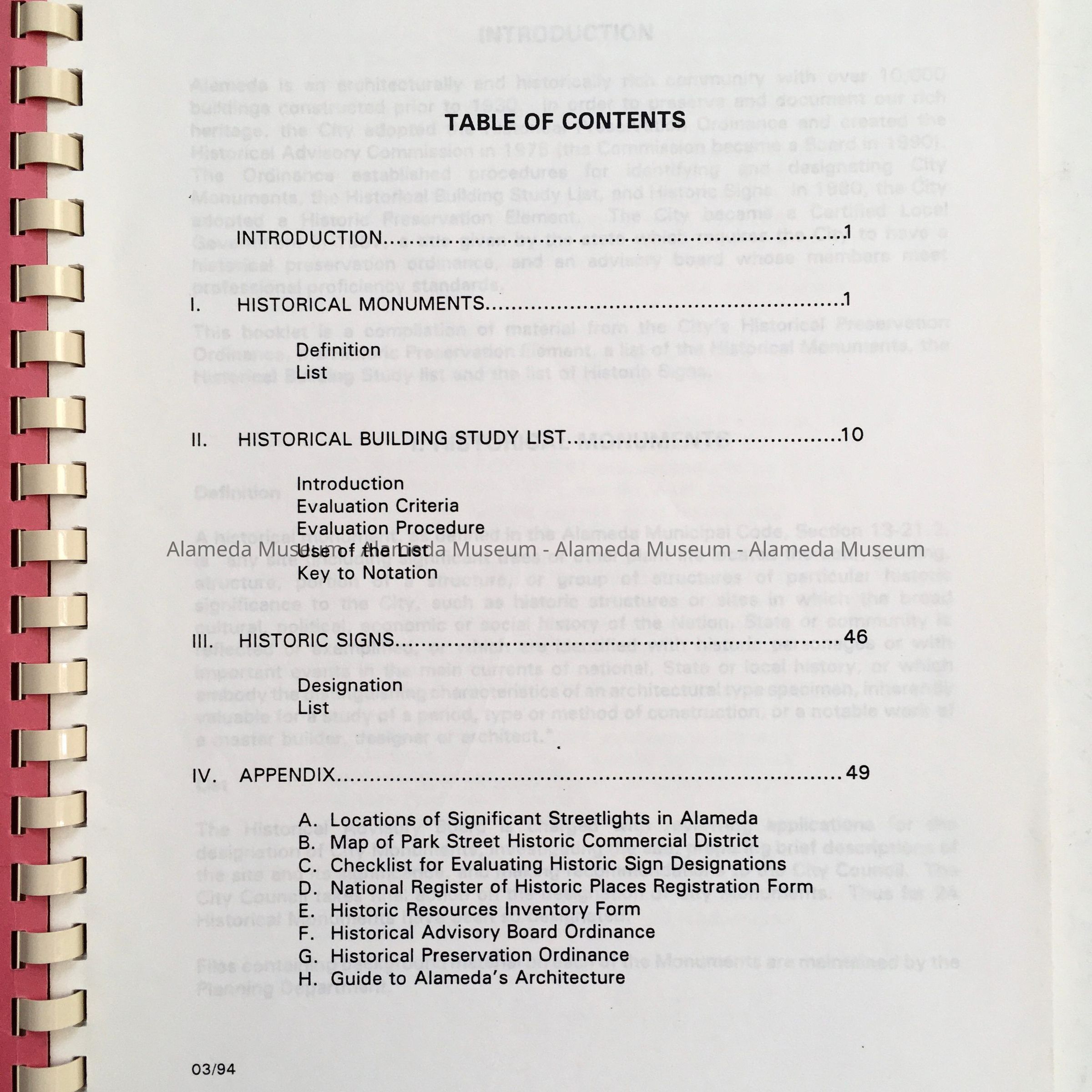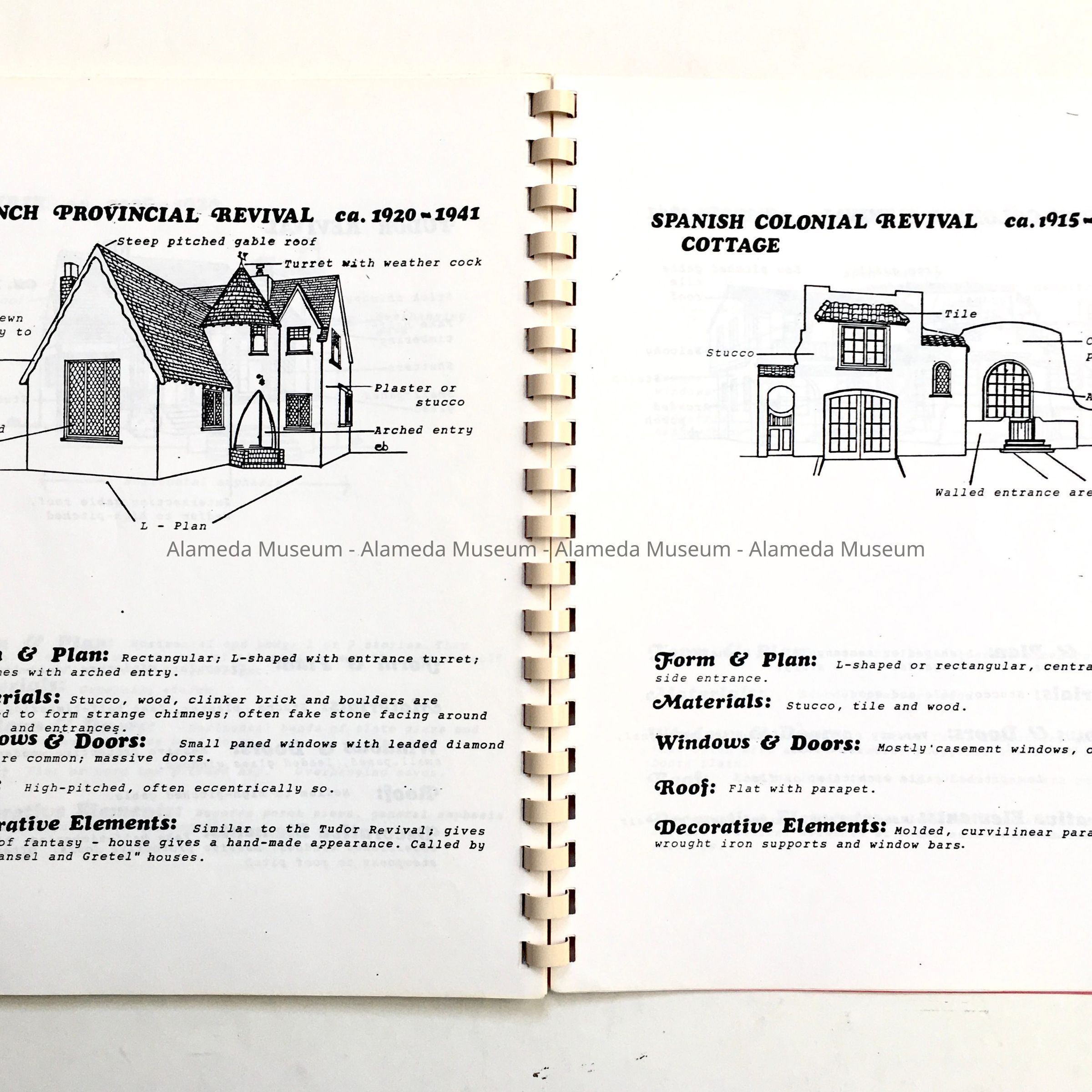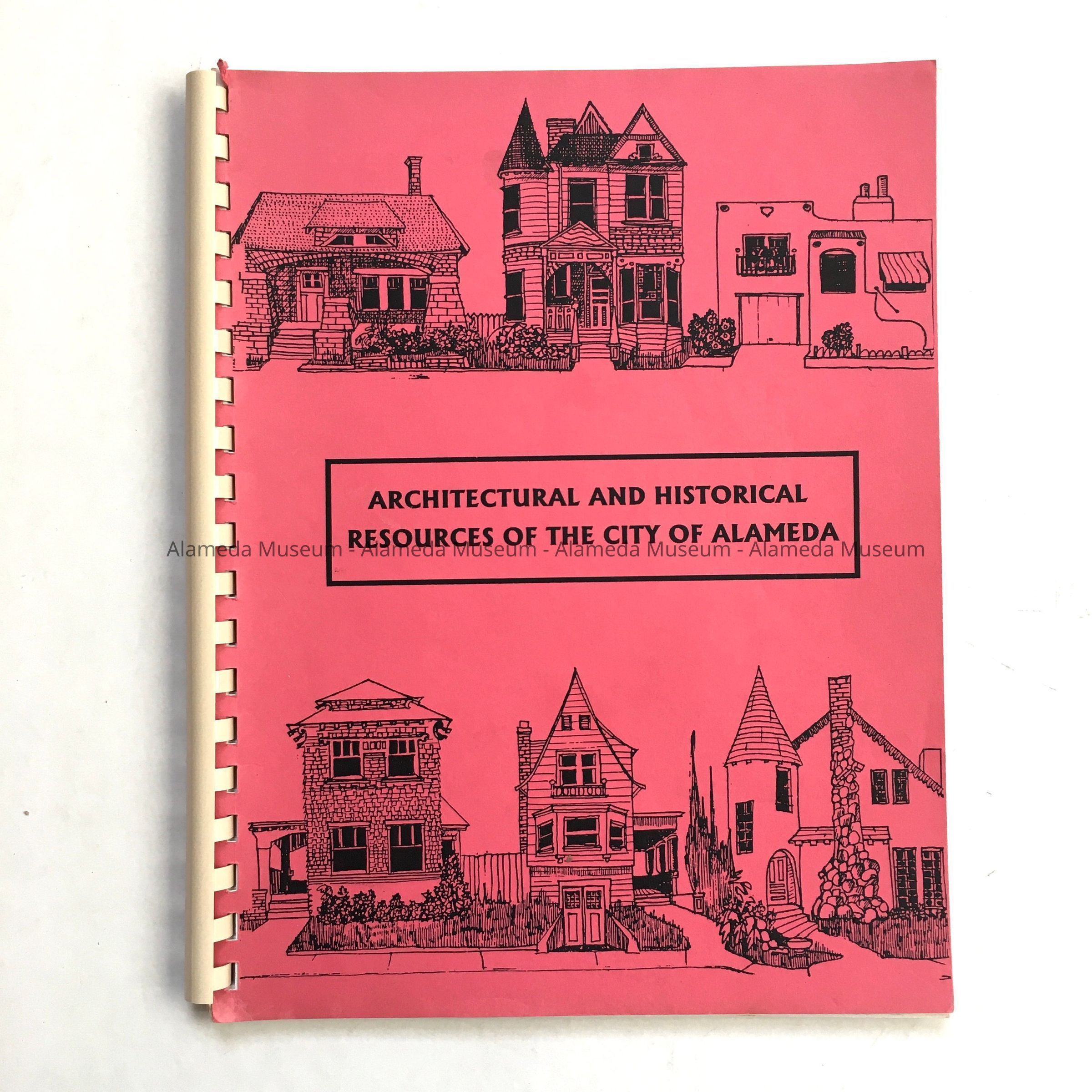 Description: Spiral-bound book, bound with plastic snap-spine, with cover of red construction paper, titled 'Architectural and Historical Resources of the City of Alameda. Front cover has image of 6 homes.