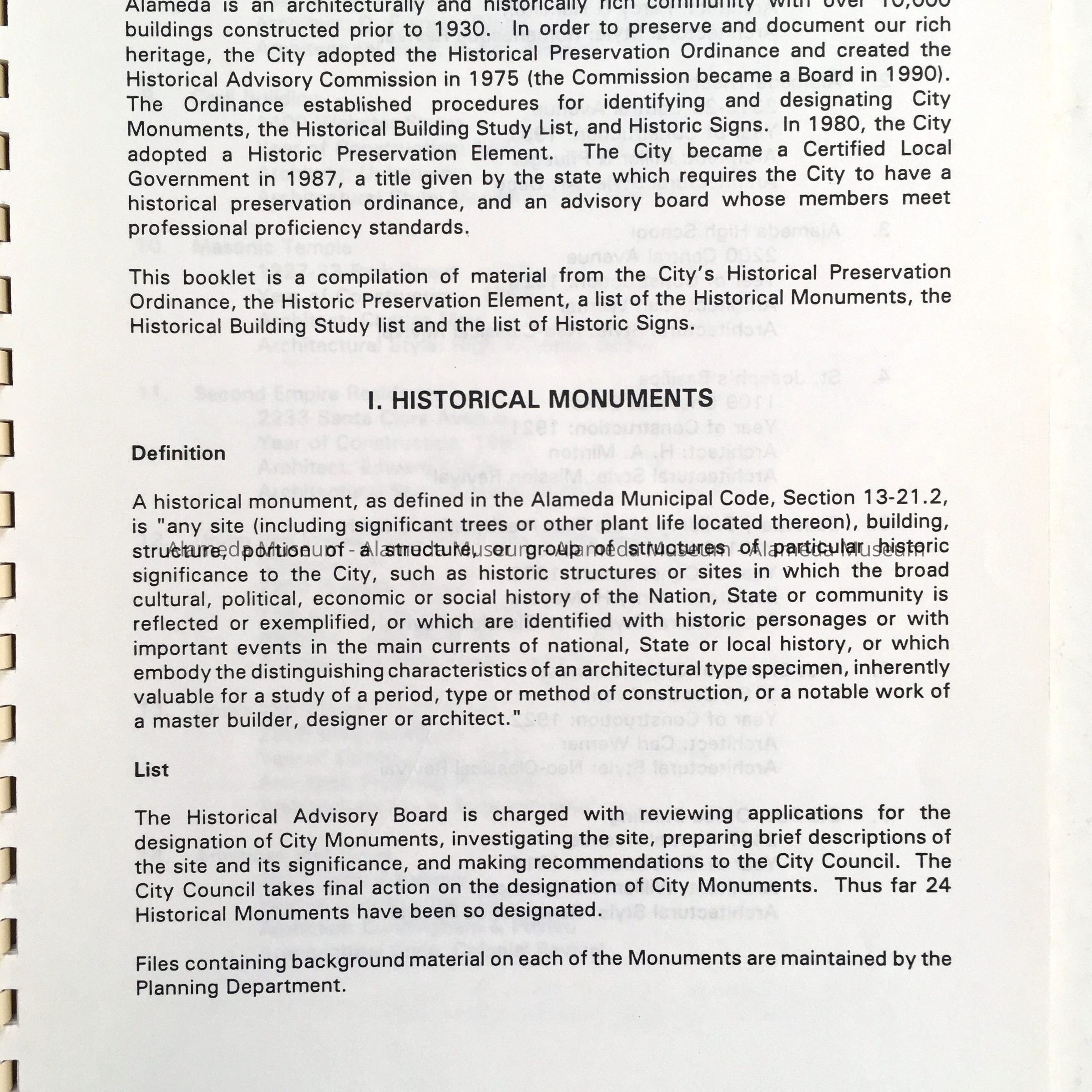 History of Object: Book listing the Historical Monuments, the Historical Building Study List first defined in 1978, the Historic Signs, and a list of building styles with characteristics.
