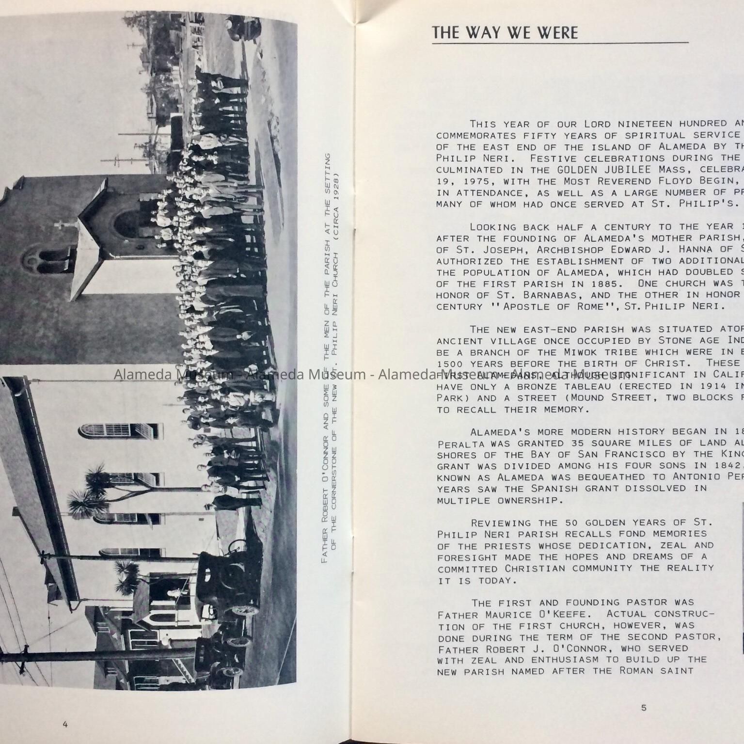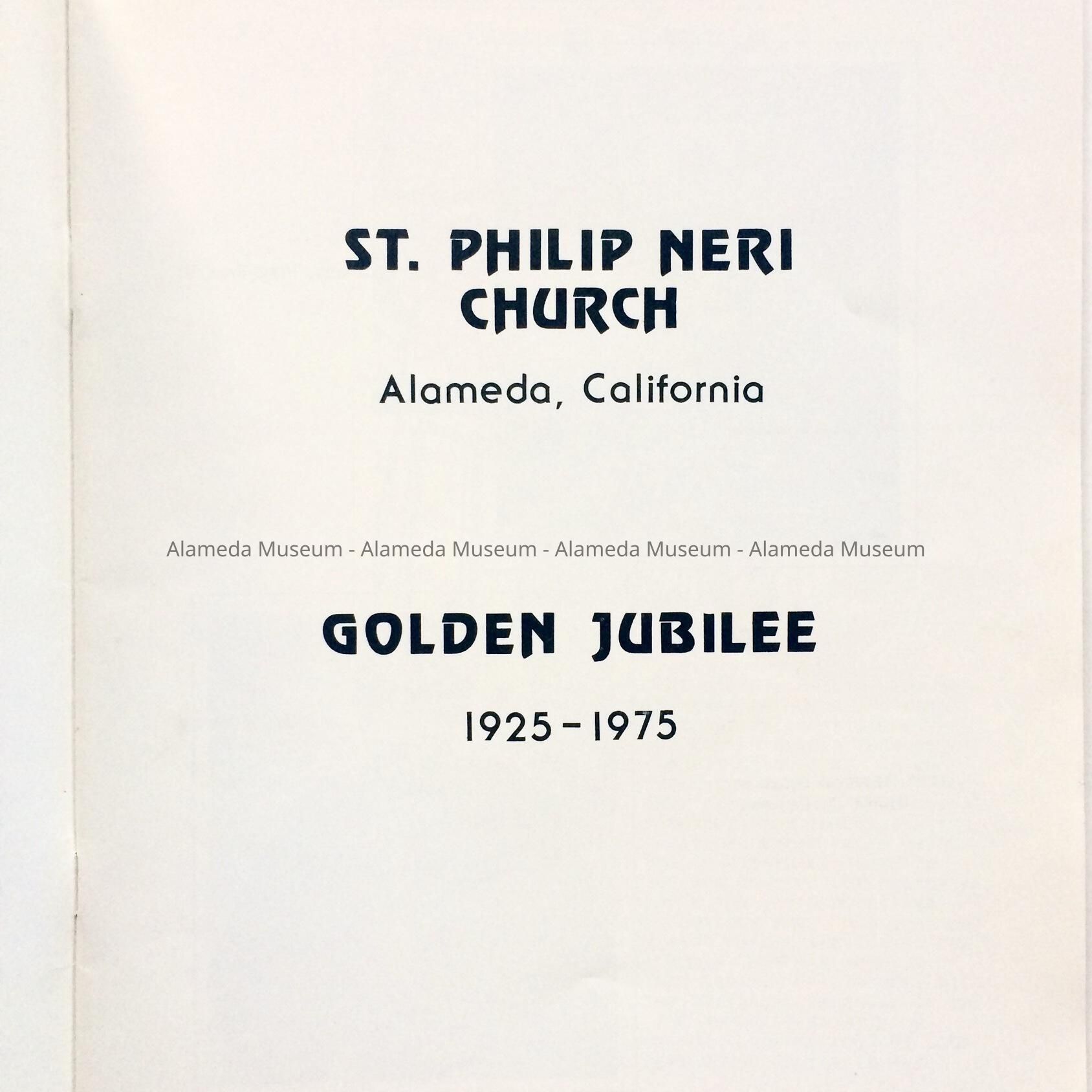 HISTORY OF OBJECT: BOOKLET PRODUCED FOR THE GOLDEN JUBILEE, 1925-1975, OF SAINT PHILIP NERI CATHOLIC CHURCH, ALAMEDA. THE PUBLICATION ALSO INCLUDES A HISTORY OF THE PARISH AND HISTORICAL PHOTOGRAPHS AS PART OF THE TEXT.