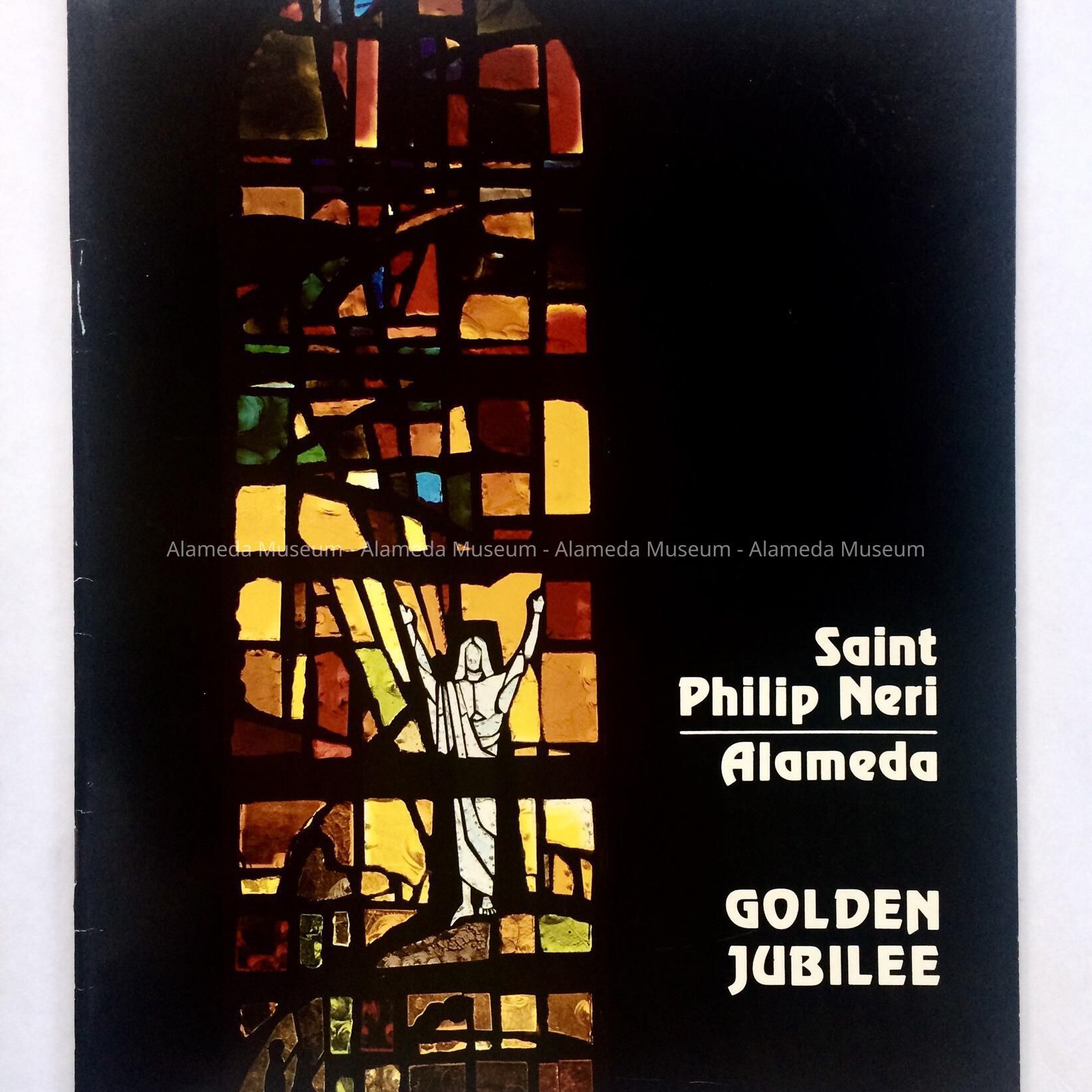 SOFT-BOUND BOOKLET, WITH COVER DESIGN CONSISTING OF A MULTI-COLORED STAINED GLASS WINDOW ON A BLACK-COLORED BACKGROUND. CAPTION IN WHITE-COLORED TYPE STATES, "SAINT PHILIP NERI, ALAMEDA, GOLDEN JUBILEE."