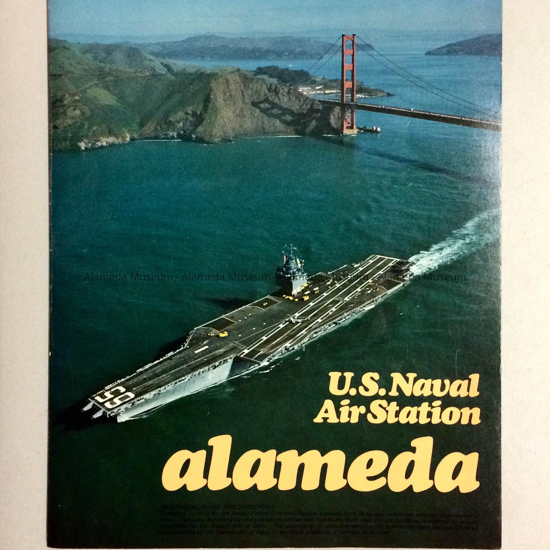 DESCRIPTION: A SOFT-COVER BOOKLET WHICH SHOWS U.S.S. NAVAL CARRIER #65 NEAR THE GOLDEN GATE BRIDGE. THE COVER ALSO HAS THE CAPTION, "U.S. NAVAL AIR STATION, ALAMEDA."