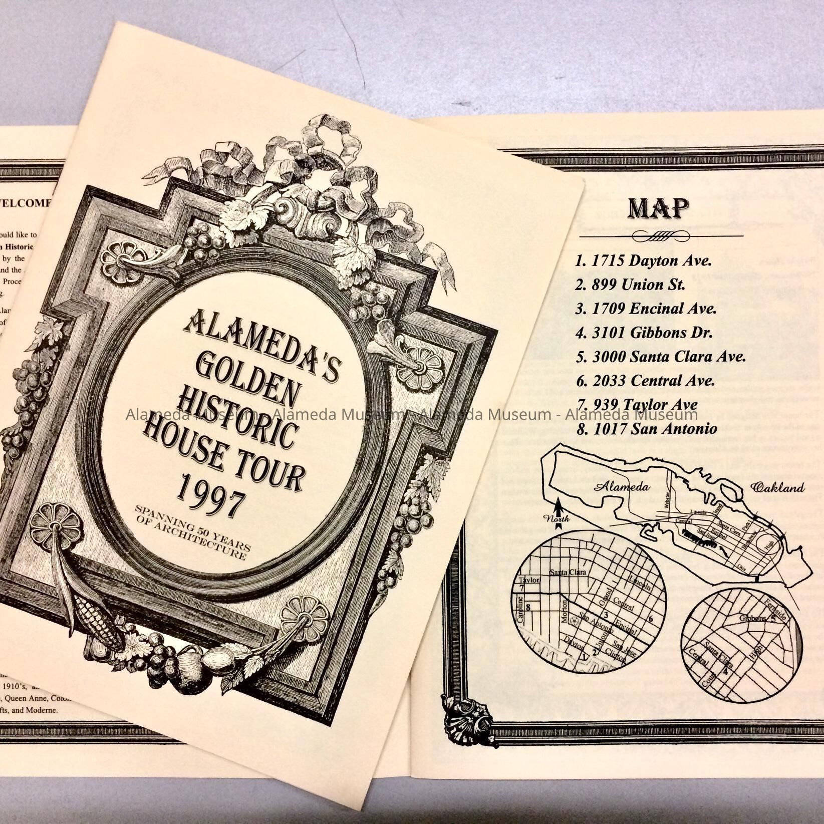 DESCRIPTION: TWO COPIES OF A SOFT-BOUND BOOKLET WITH ILLUSTRATED COVER. BOLD-PRINTED CAPTION STATES, "ALAMEDA'S GOLDEN HISTORICAL HOUSE TOUR, 1997."