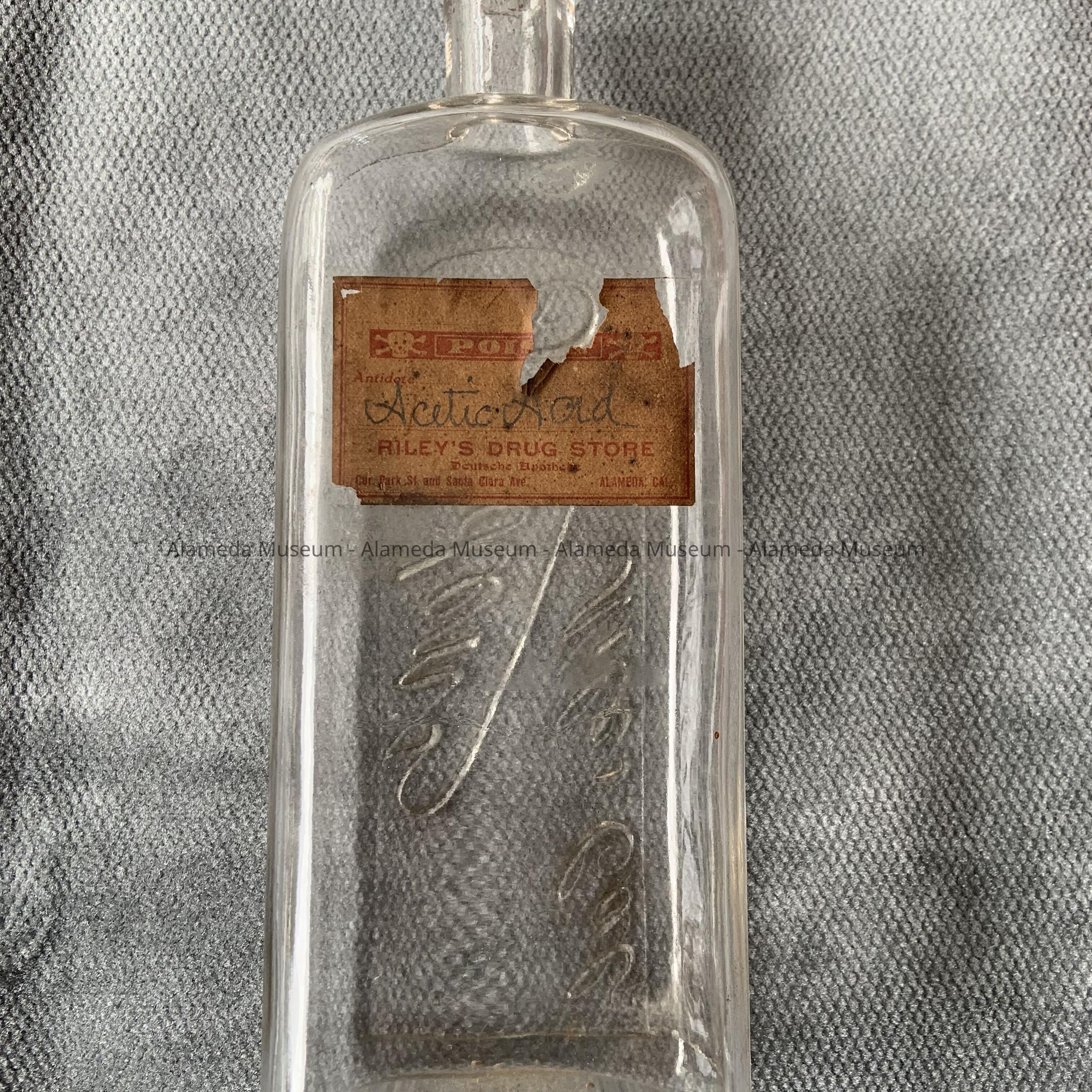 History of Object: This bottle originally contained acetic acid purchased at Riley's Drug Store, corner of Park Street and Santa Clara Avenue.