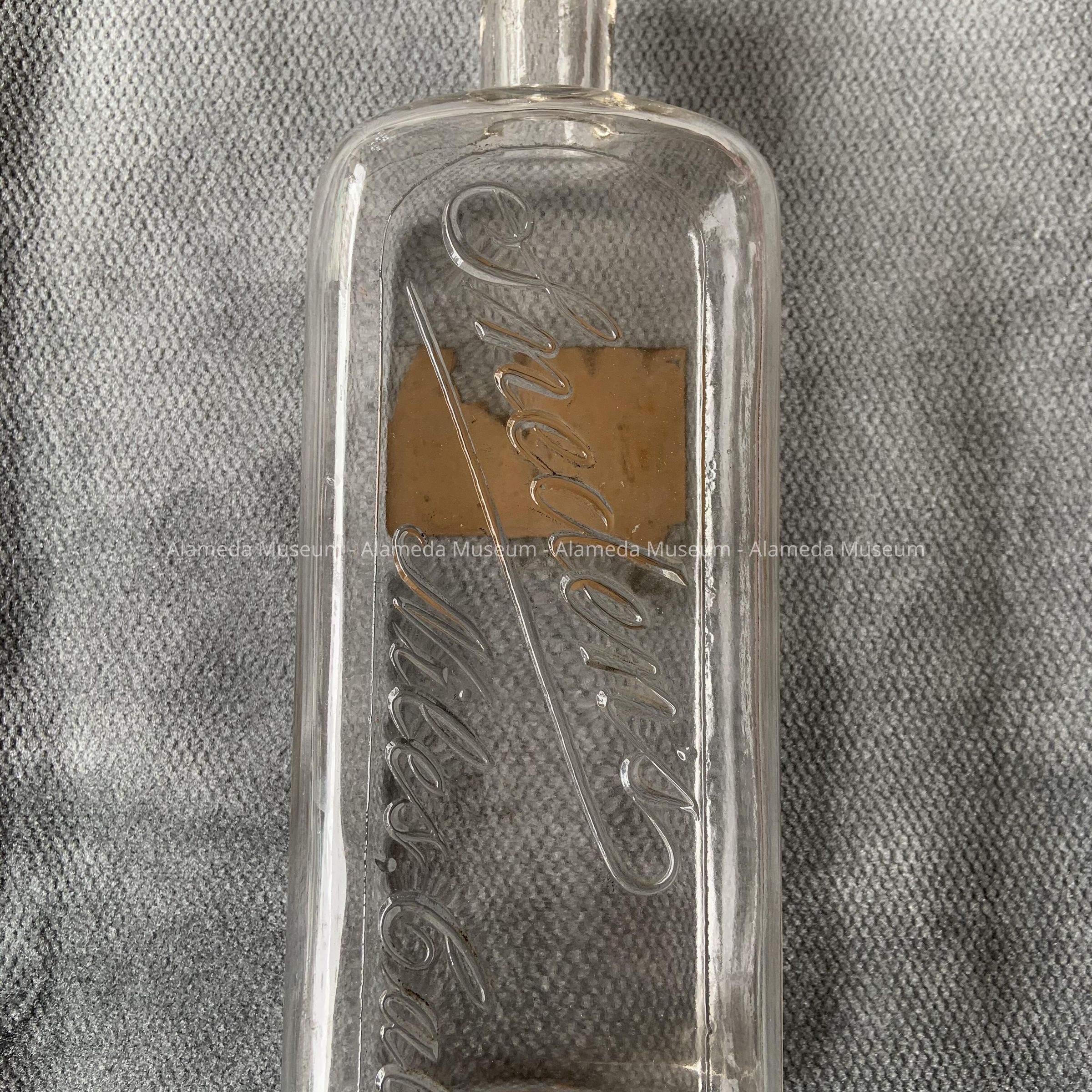 Embossed clear glass bottle with original paper label advertising "Riley's Drug Store corner of Park Street and Santa Clara Avenue." Circa early 1900's.