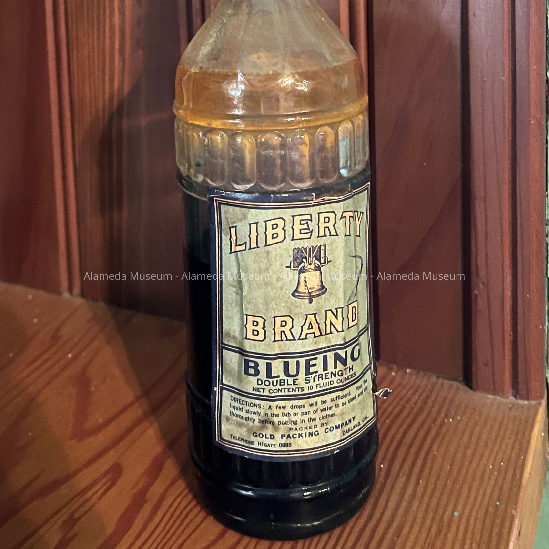 BOTTLE OF BLUING FOUND IN THE BASEMENT OF THE MEYERS' HOME AT 2021 ALAMEDA AVENUE, ALAMEDA, ON A SHELF NEAR THE WASH TUB.