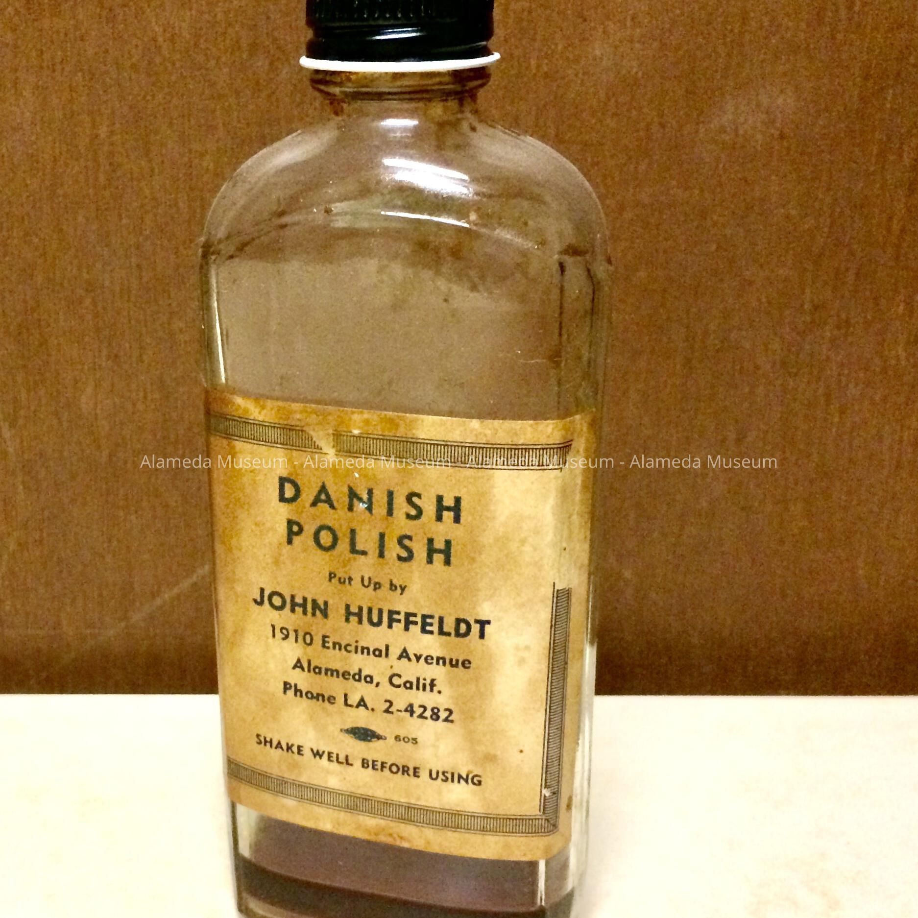A GLASS BOTTLE, WITH ORIGINAL ATTACHED PRINTED LABEL, STATING "DANISH POLISH," FILLED BY JOHN HUFFELDT, 1910 ENCINAL AVENUE, ALAMEDA. TELEPHONE LA 2-4282.