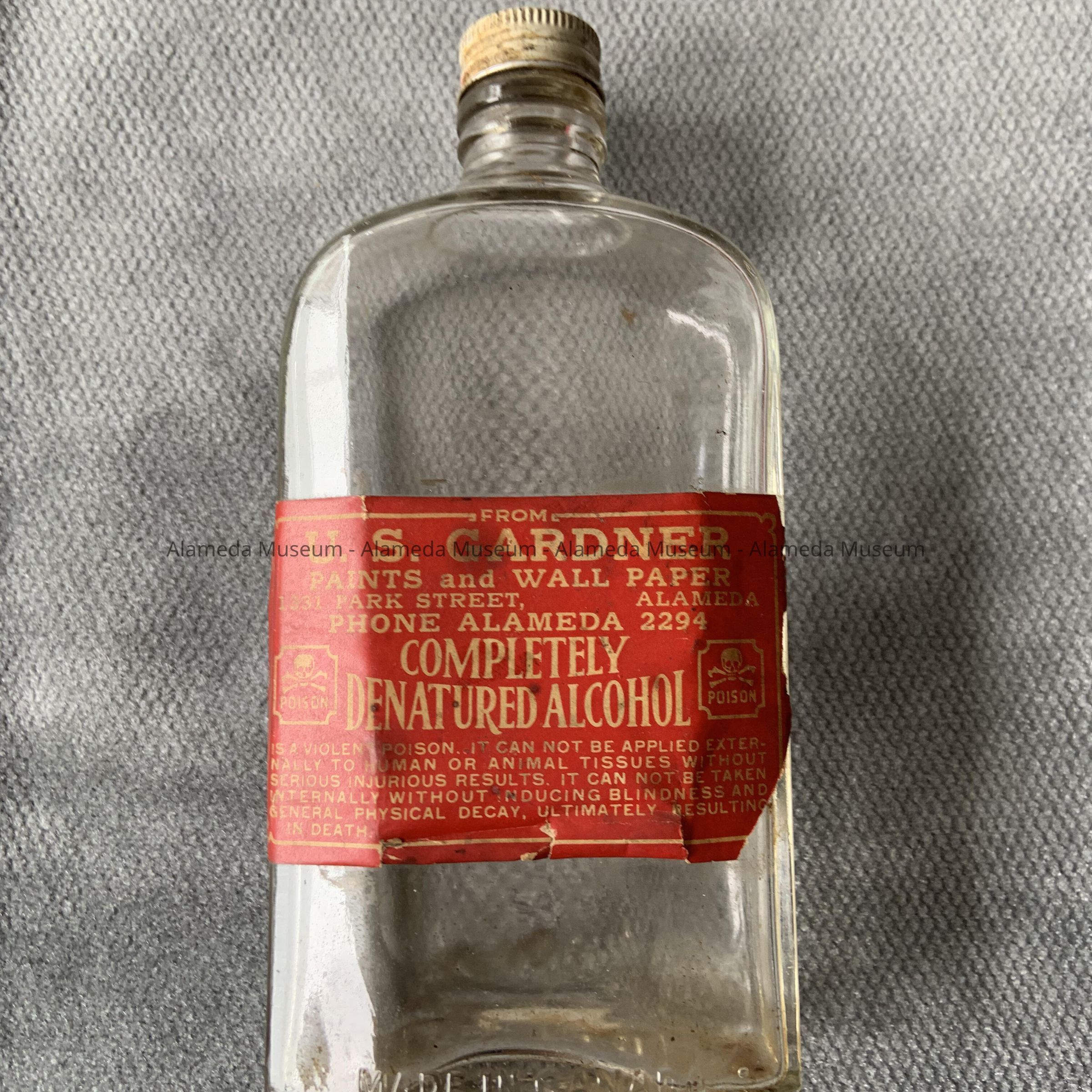 Bottle containing denatured alcohol purchased from U. S. Gardner, paints & wall paper, 1331 Park Street, Alameda, phone Alameda 2294. Bottle found at 1625 San Antonio Avenue.