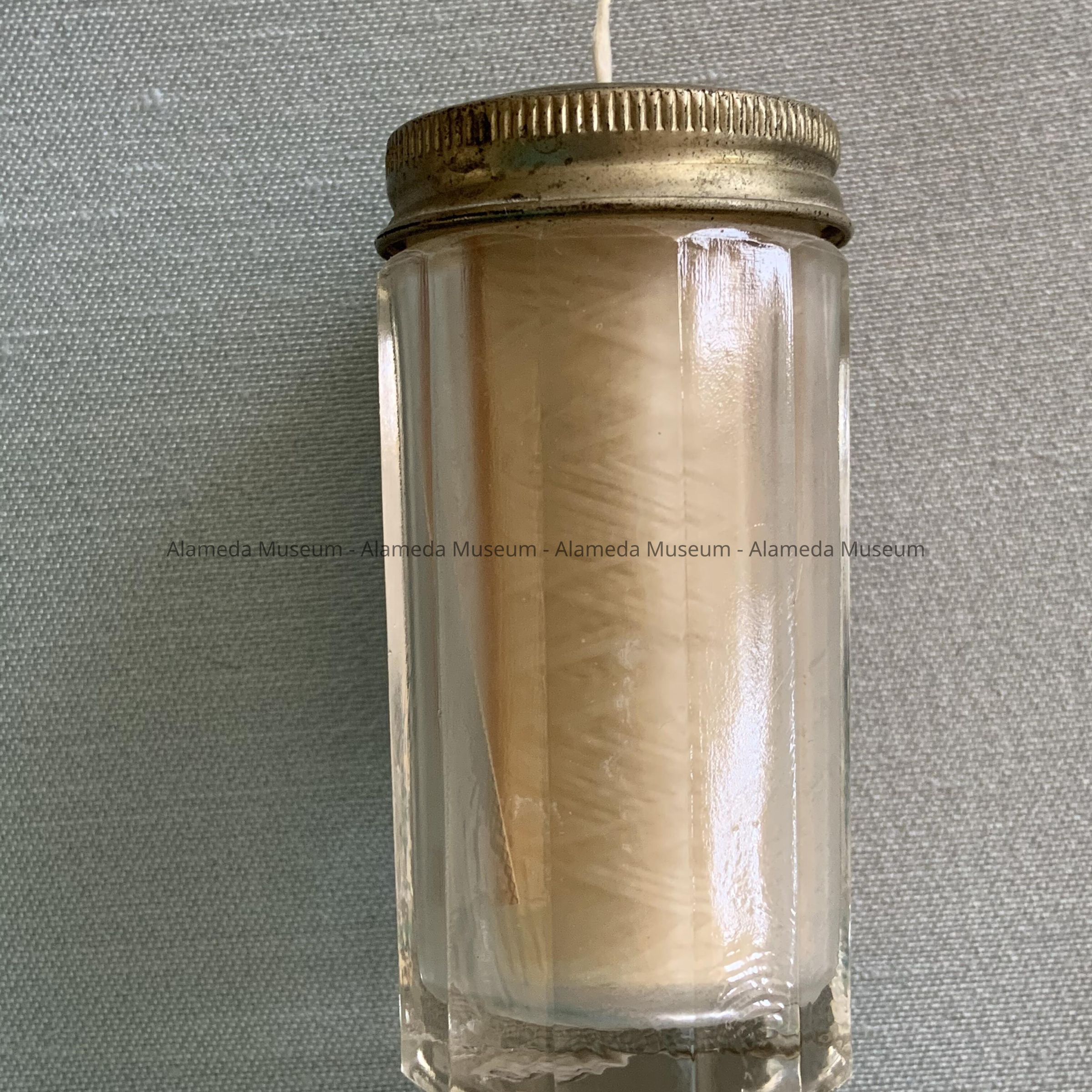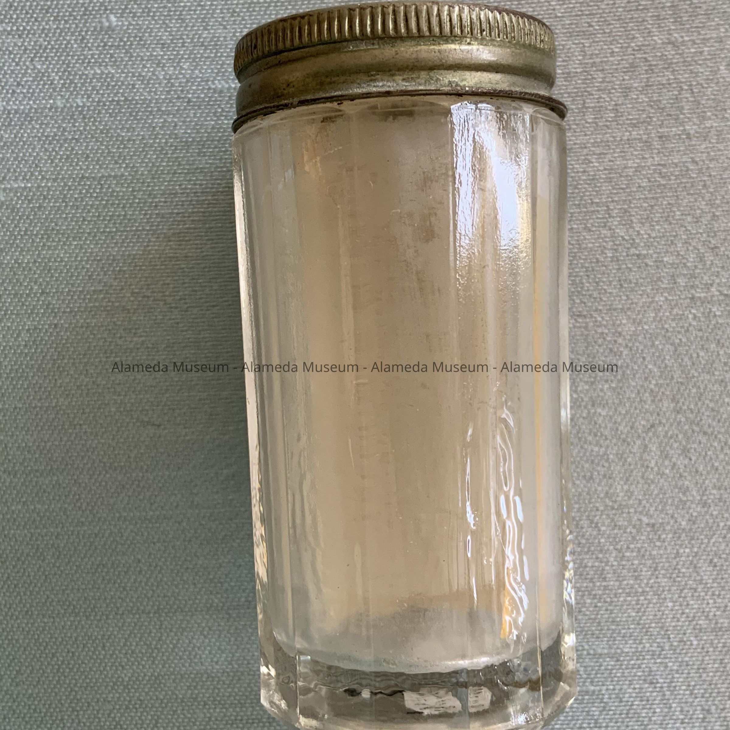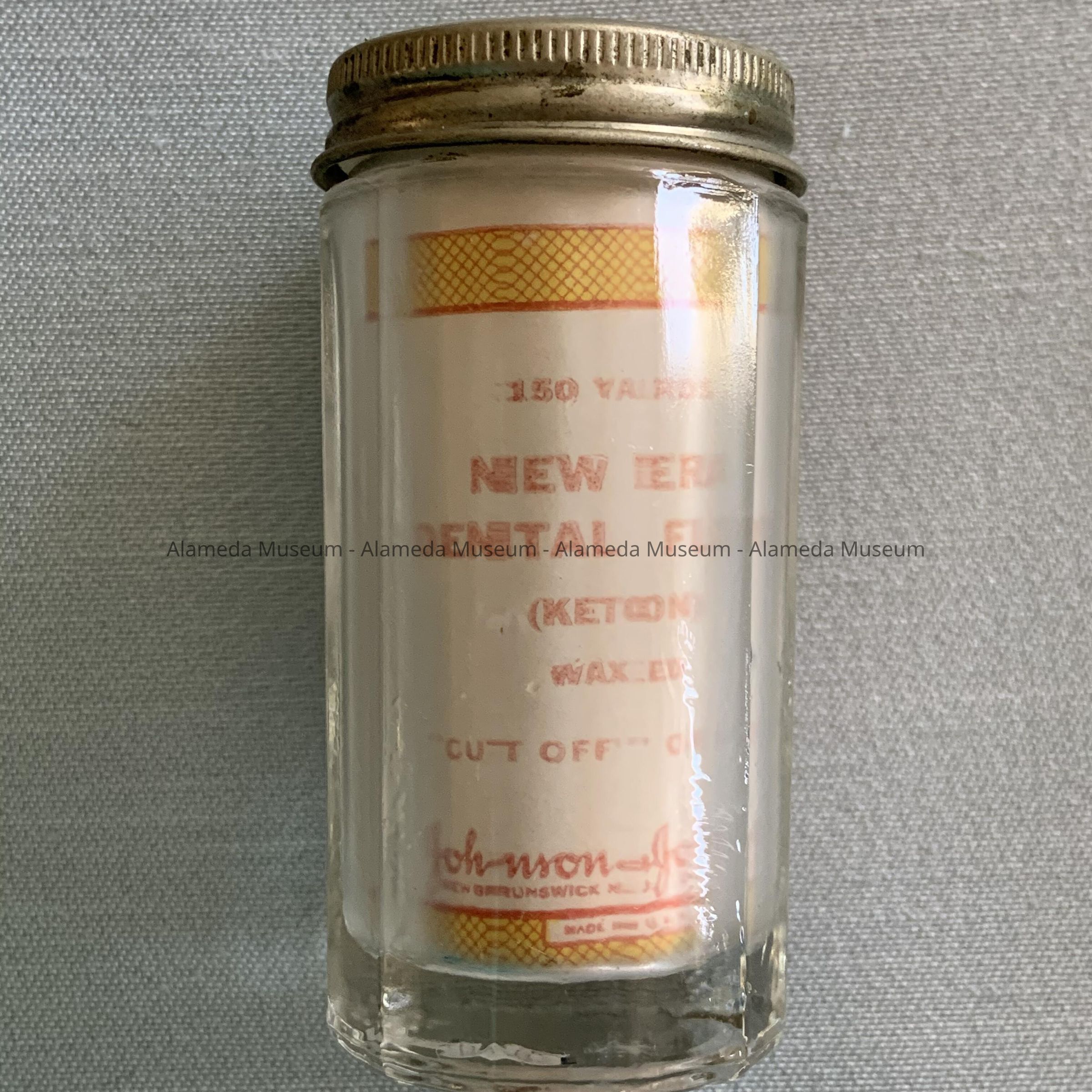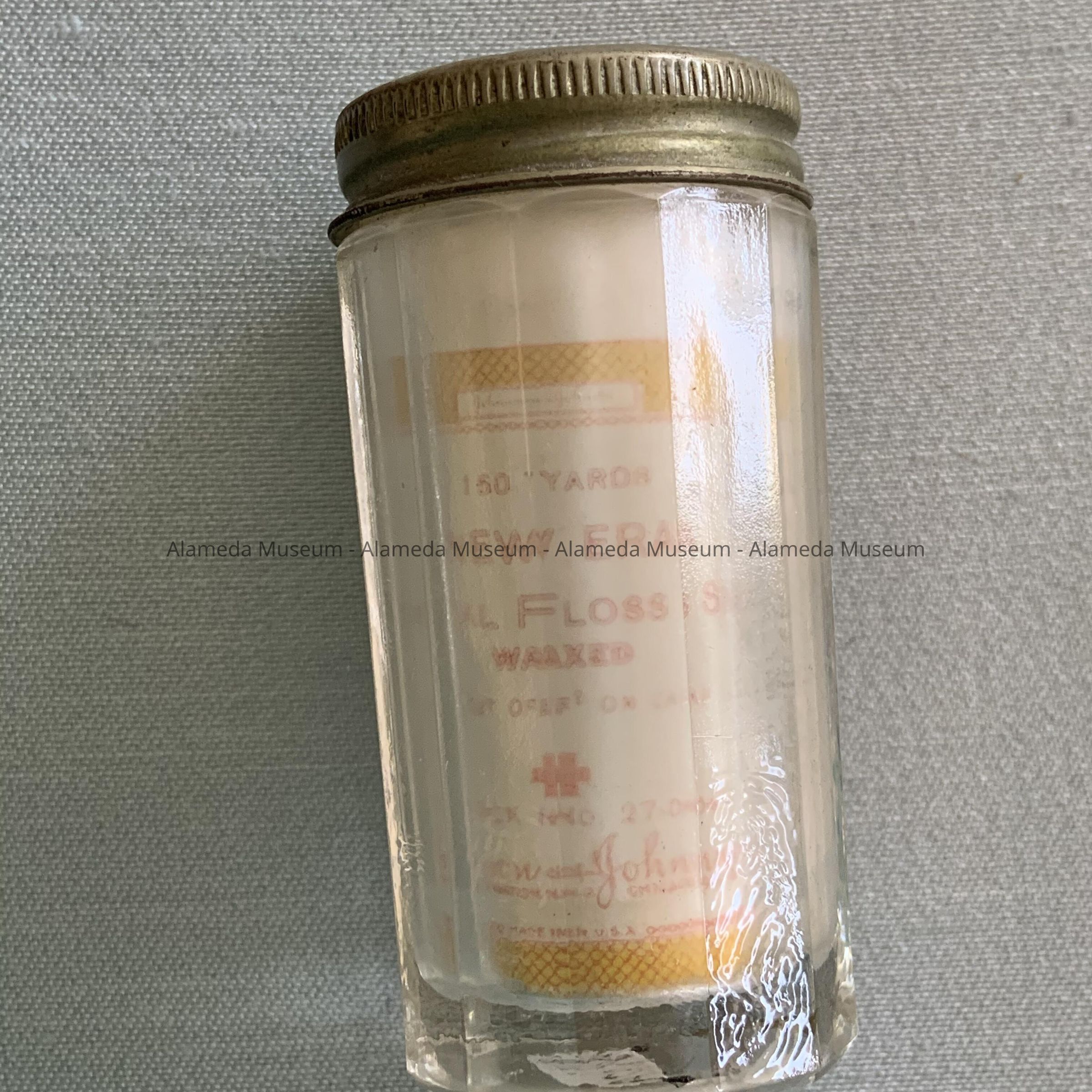 Description: Faceted clear glass floss containers with removable nickel-plated lids. Their interiors have paper labels that read, "New Era Dental Floss, Johnson and Johnson.”