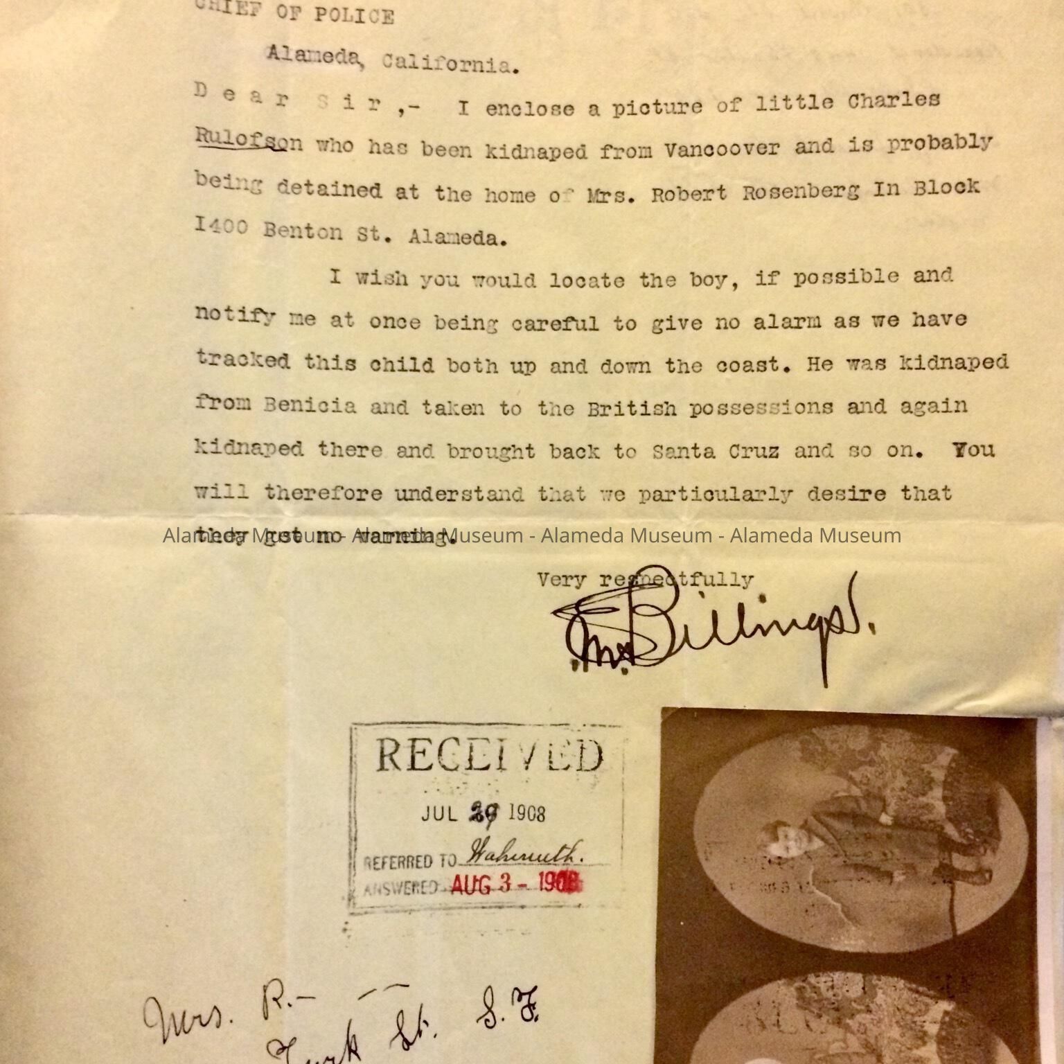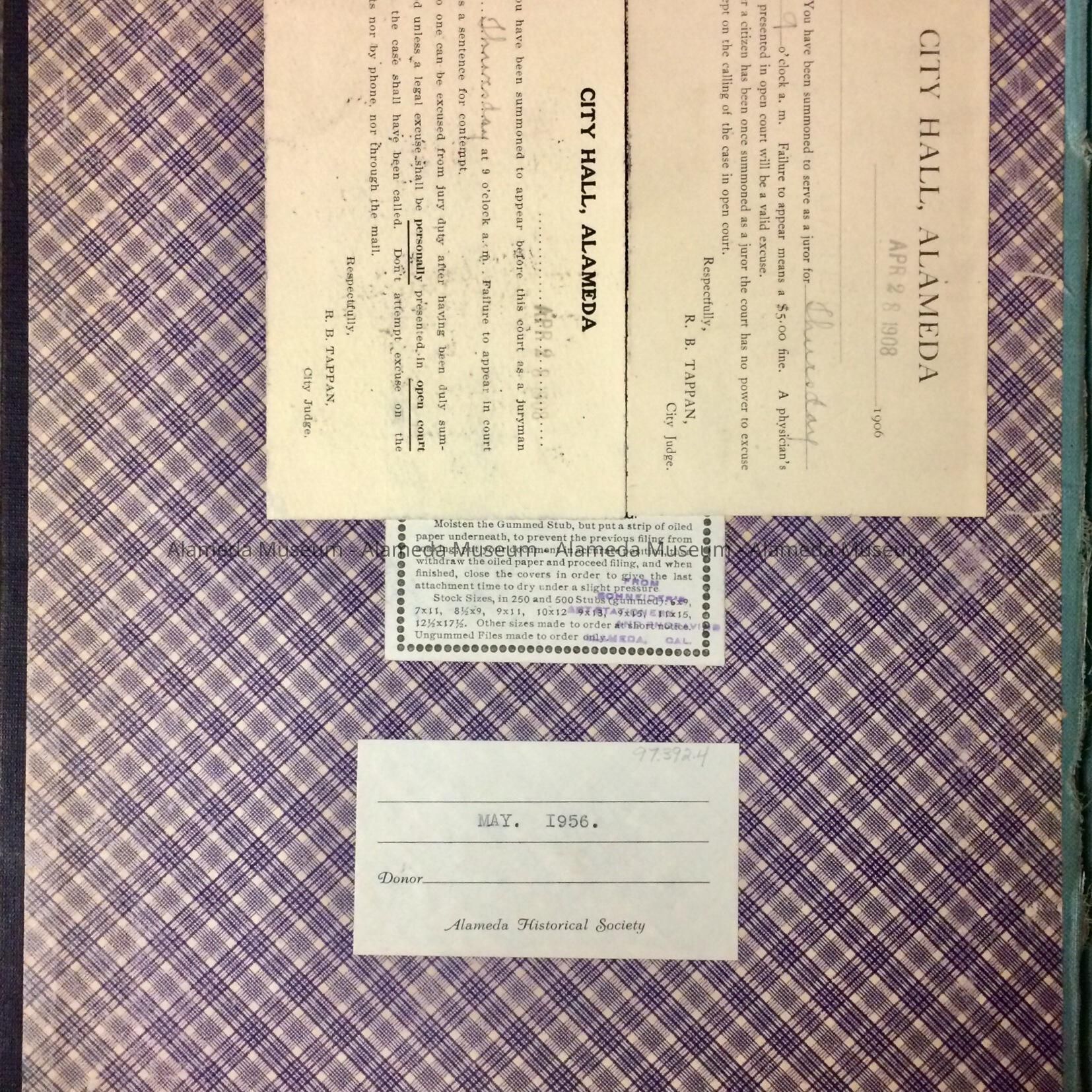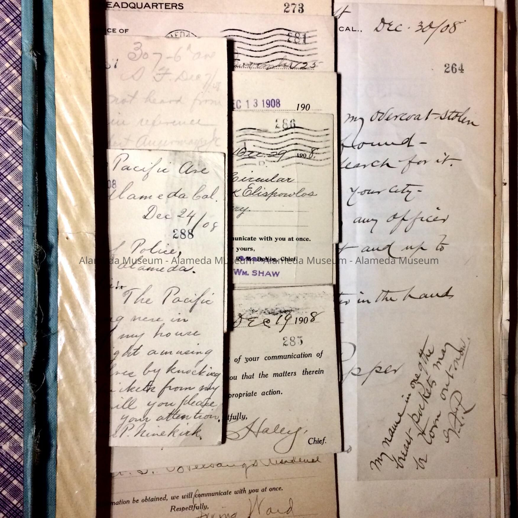 ALBUM CONTAINING CORRESPONDENCE ADDRESSED TO JOHN CONRAD, CHIEF OF POLICE, CITY OF ALAMEDA, CONCERNING POLICE ACTIVITIES, ETC., FOR THE YEAR 1908. SOME OF THE CORRESPONDENCE INCLUDES "MUG SHOTS" AND PHOTOGRAPHS OF MISSING PERSONS. VOLUME WAS ORIGINALLY GIVEN TO THE ALAMEDA HISTORICAL SOCIETY IN MAY OF 1956, AND NUMBERED "54x." THE SOCIETY MADE NO RECORD OF THE DONOR'S NAME.