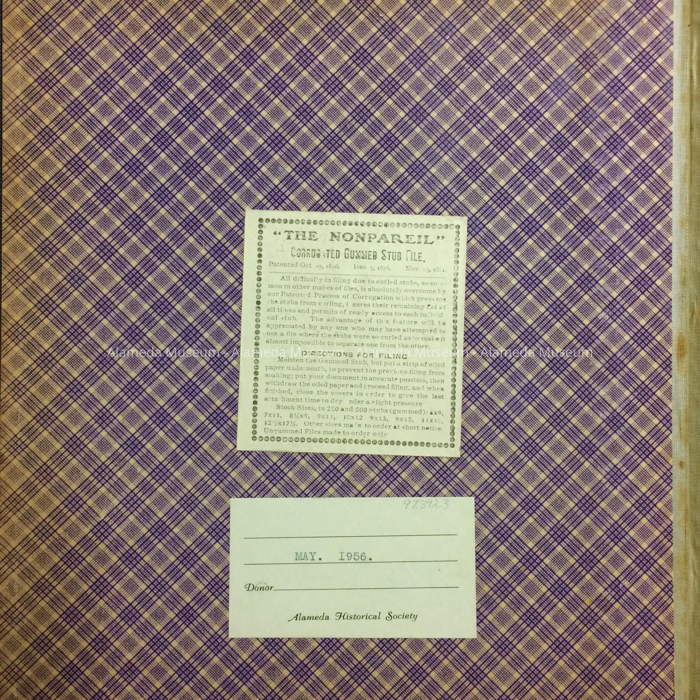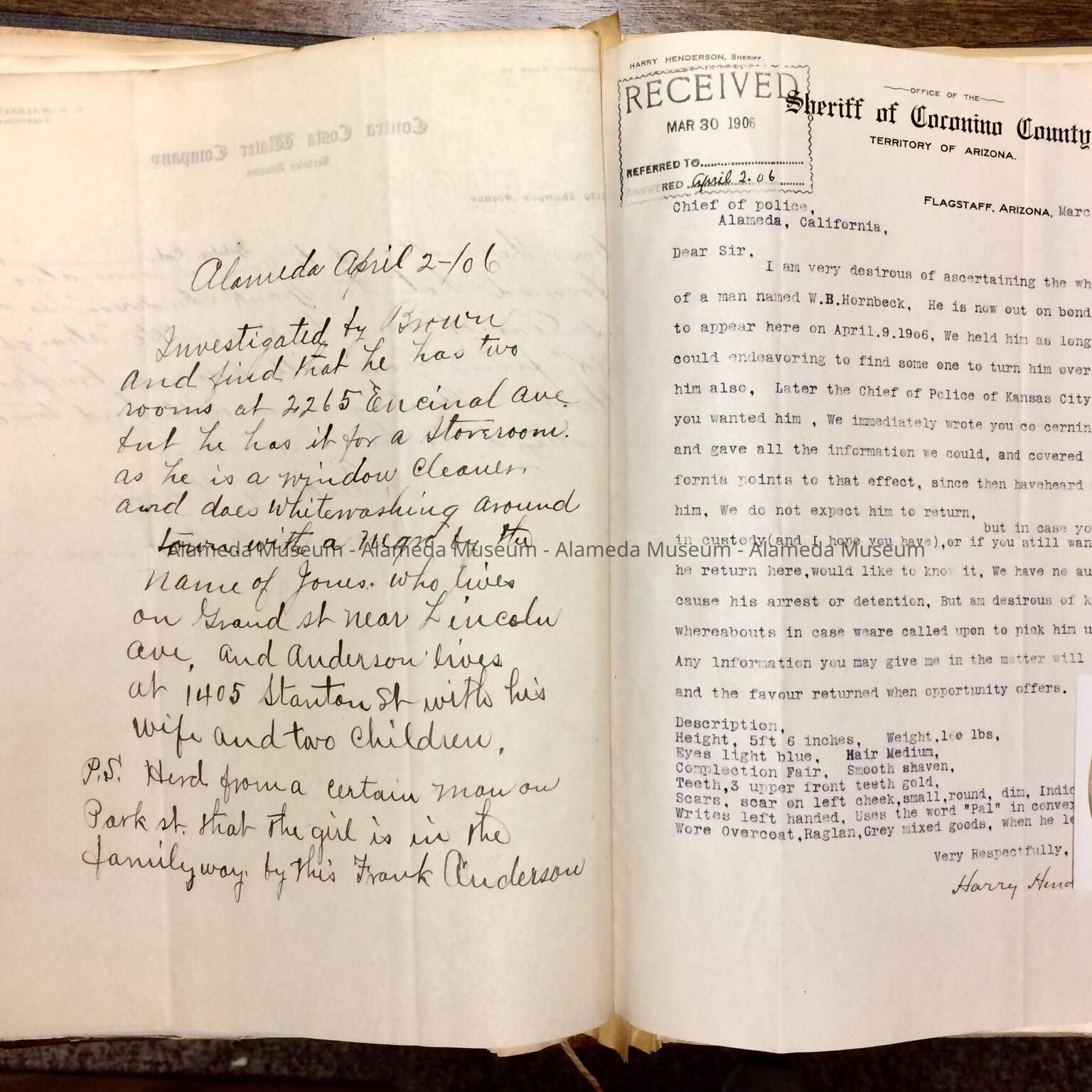 CORRESPONDENCE ADDRESSED TO J. CONRAD, CHIEF OF POLICE, CITY OF ALAMEDA, FROM 1904 THRU 1906. LETTERS RELATING TO POLICE BUSINESS, MISSING PERSONS, CRIMES, ETC. ARE CONTAINED THEREIN. ALBUM WAS PRESENTED TO THE ALAMEDA HISTORICAL SOCIETY IN MAY 1956, AND ORIGINALLY NUMBERED "53X." THE SOCIETY MADE NO RECORD OF THE DONOR'S NAME.