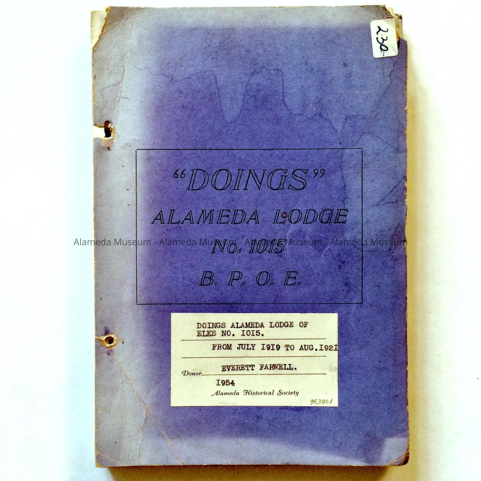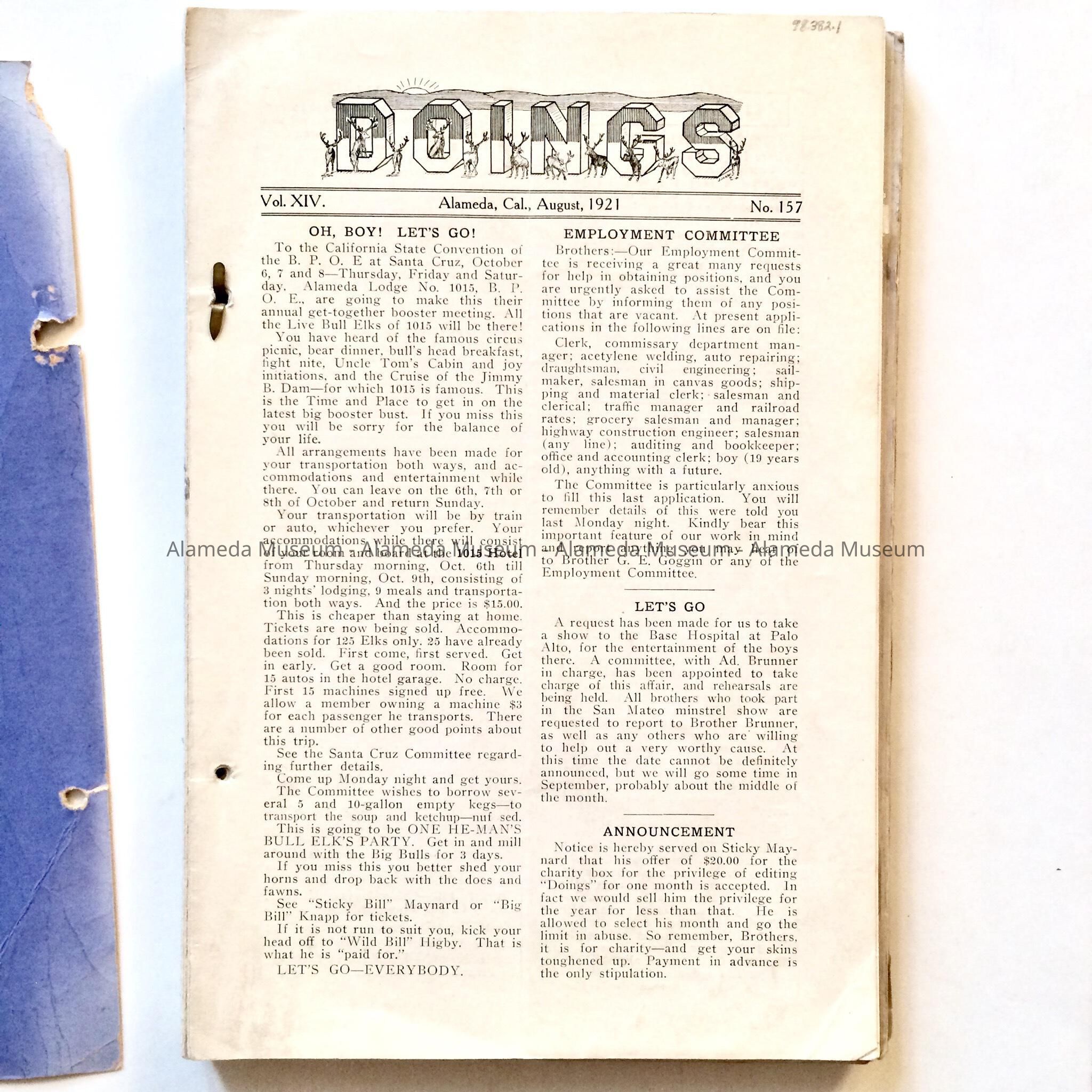 History of Object: Publication entitled "Doings" published by the Alameda Lodge No. 1015 B.P.O.E., ranging from July 1919 through August, 1921. This object was given to the A.H.S. prior to 1971 by Everett Farwell, an early member of the Society in 1954.