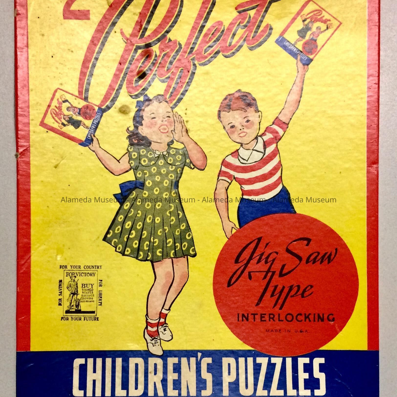 Description: A decorated box containing two interlocking jigsaw puzzles with a young boy and girl and the inscription, "2 Perfect Children's Puzzles''. The box contains two completed puzzles each nesting within a cardboard frame. Manufacturer unknown.