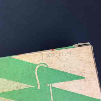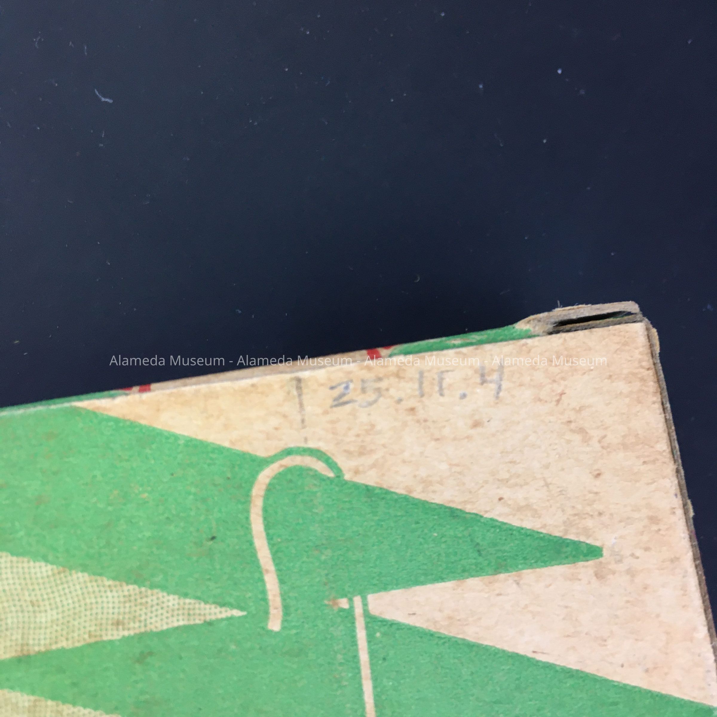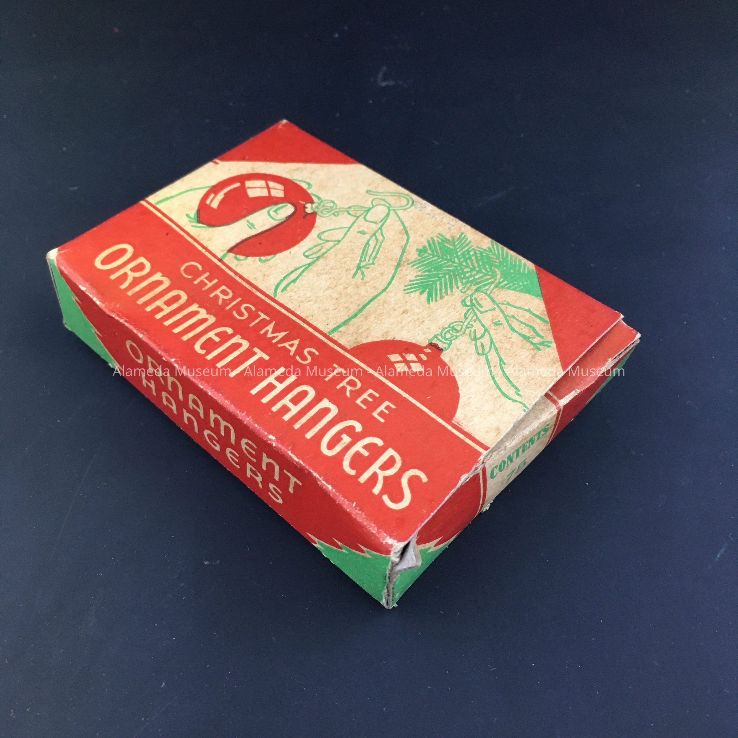 Description: cardboard box in with printed seasonal images of tree branches in red and green, filled with pieces of metal with one end turned into a small, and the other into a bigger loop. Box states ‘Christmas Tree Ornament Hangers’, and Manufactured by the National Tinsel Mfg. Company.