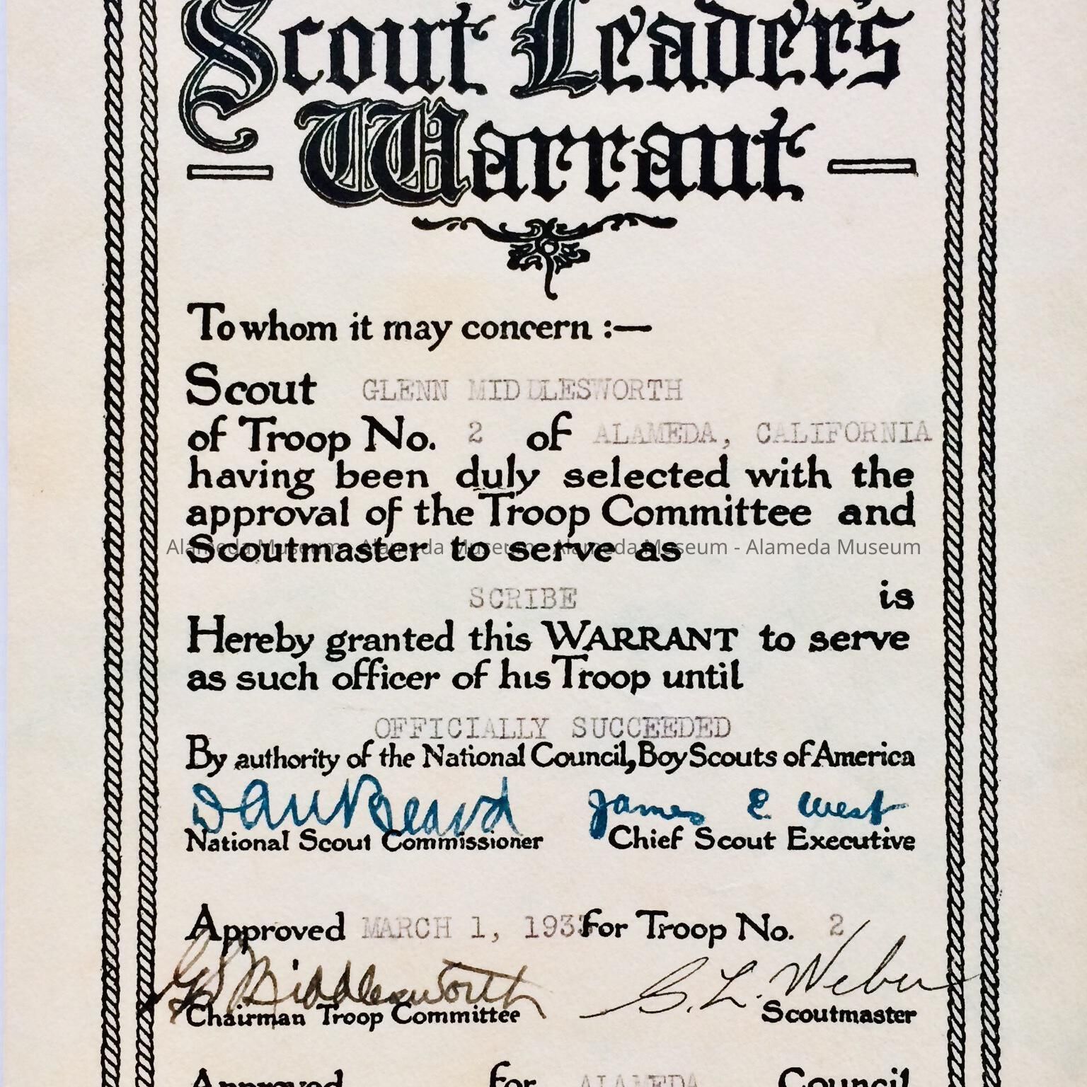 History of Object: Award bestowing the rank of "Scribe", to Glenn Middlesworth, Troop #2, Alameda Boy Scouts, Alameda, Ca., 1933.