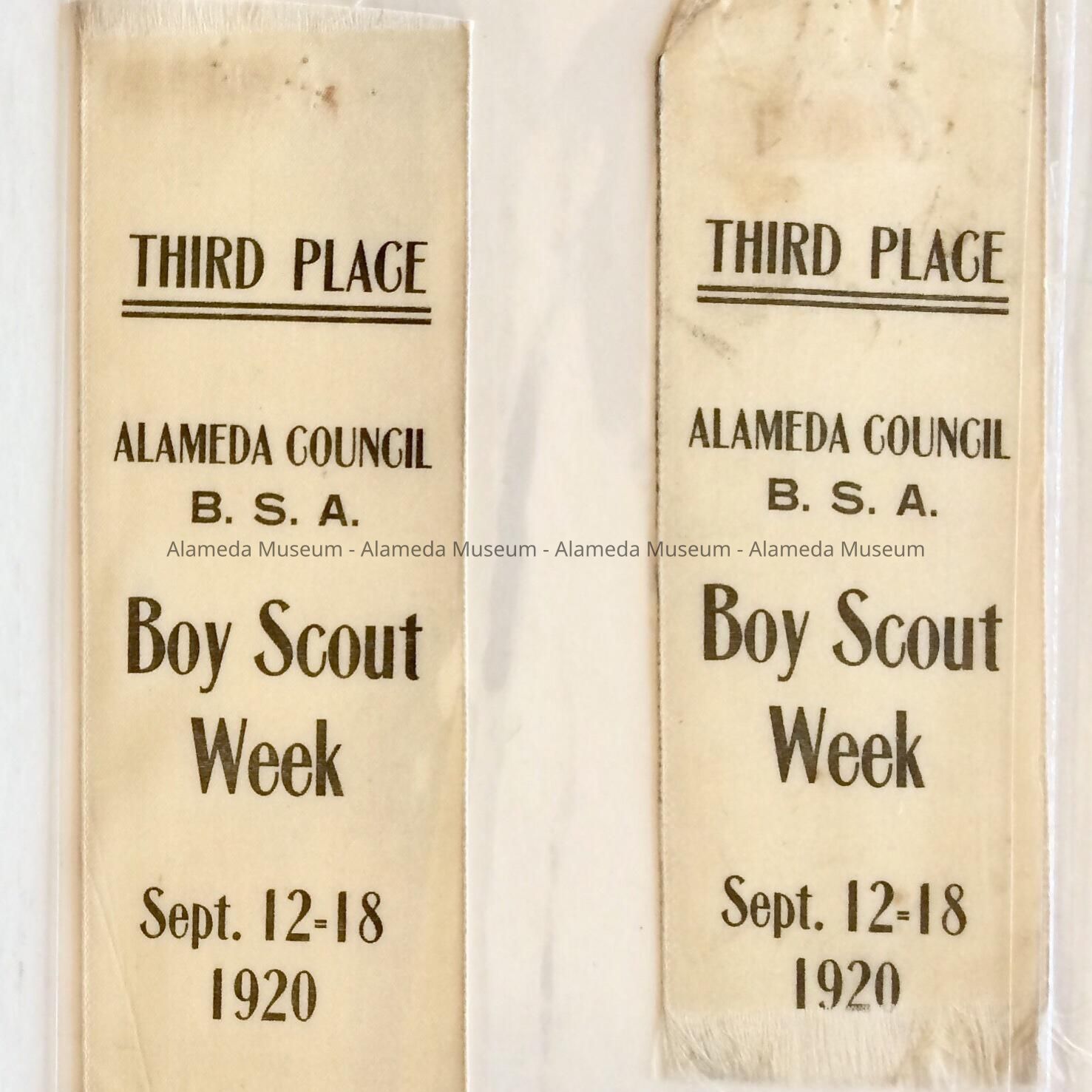 Award ribbons owned by the late Dick Bartell, National League baseball player, who was raised and attended schools in Alameda. The ribbons awarded for third place by the Alameda Council Boy Scouts of America during Boy Scout Week, September 12-18, 1920.