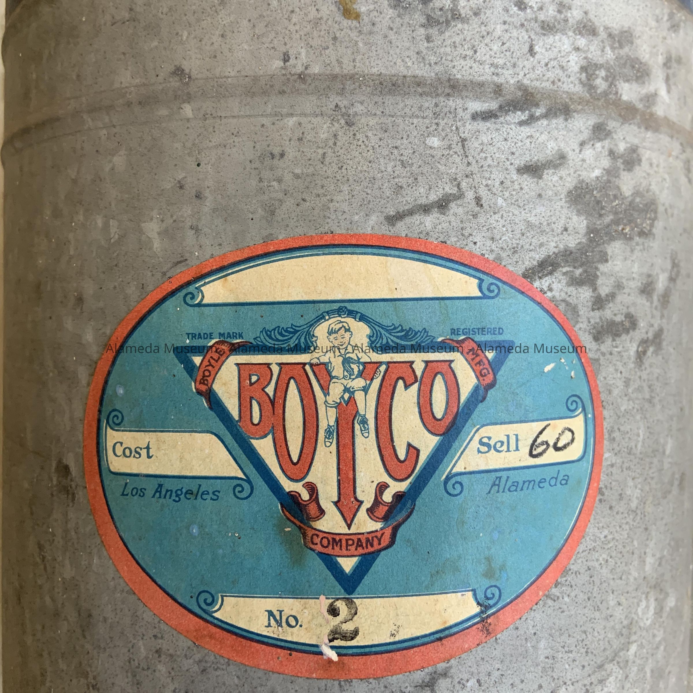 Description: A galvanized circular-shaped container with a screw top and a bail handle that has a wooden grip. Attached to the container is an original paper label in blue and red colored type stating: "BOYCO".