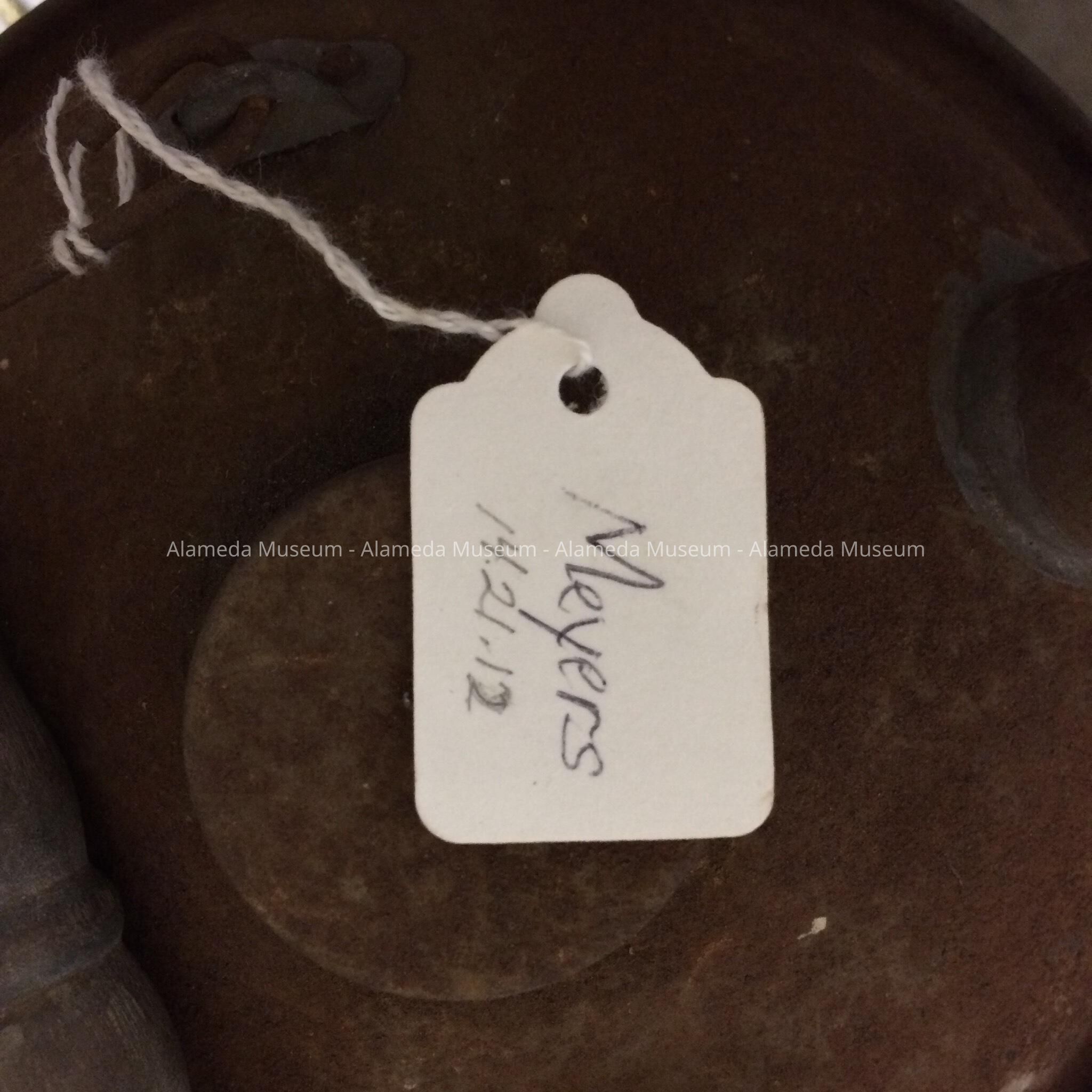 History of Object: A liquid container found in the "pump house" on the grounds of the Meyers House estate, and it was most likely purchased by Henry H. Meyers. It was manufactured in Alameda by the BOYCO Co. on the 1800 block of Oak St. Some of BOYCO's early products, such as this example, have a cobalt blue decorative band at the upper and lower extremes of the container; this decoration appears to have been discontinued at a later date.