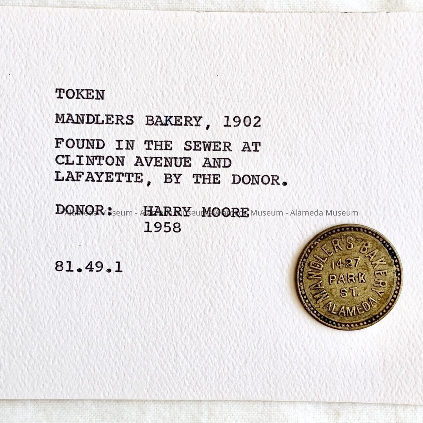 Description: Brass token one inch in circumference with raised lettering. Mandler's Bakery, 1427 Park Street, Alameda. Opposite side it says "Good for one small loaf".