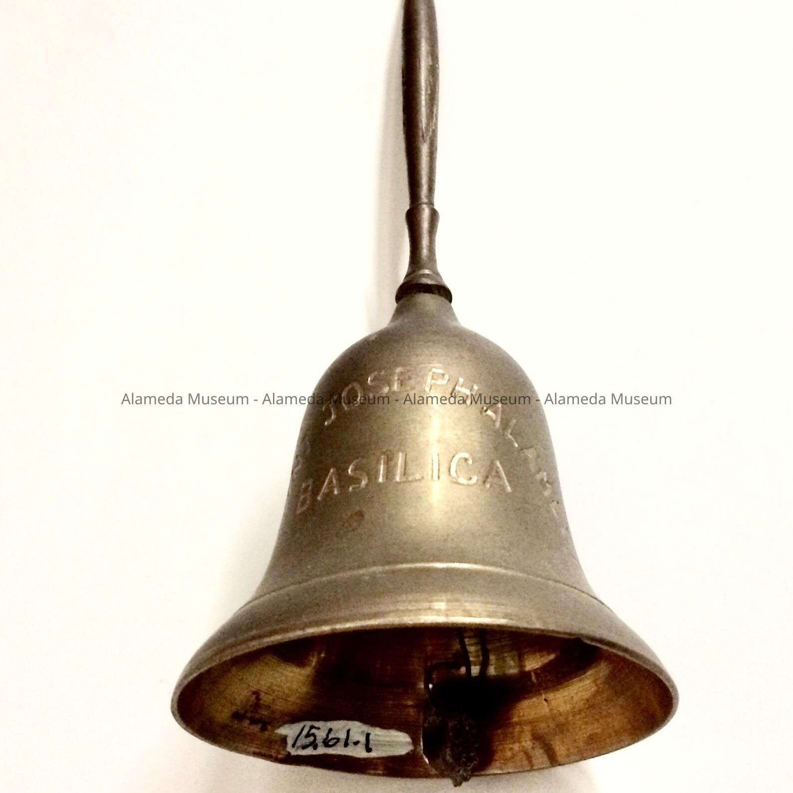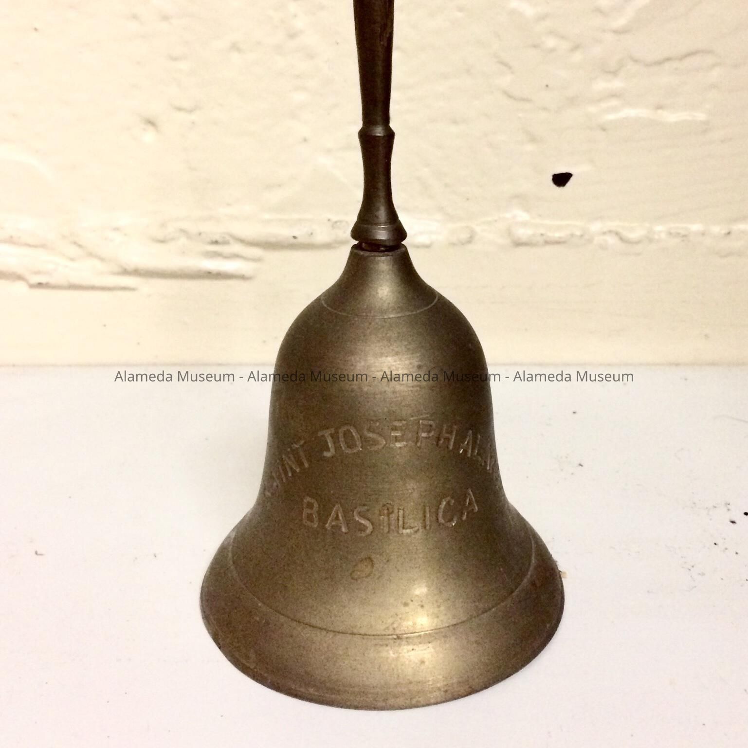 A BRASS HAND BELL, WITH ATTACHED HANDLE. BELL HAS AN ENGRAVED MESSAGE, "SAINT JOSEPH, ALAMEDA BASILICA."