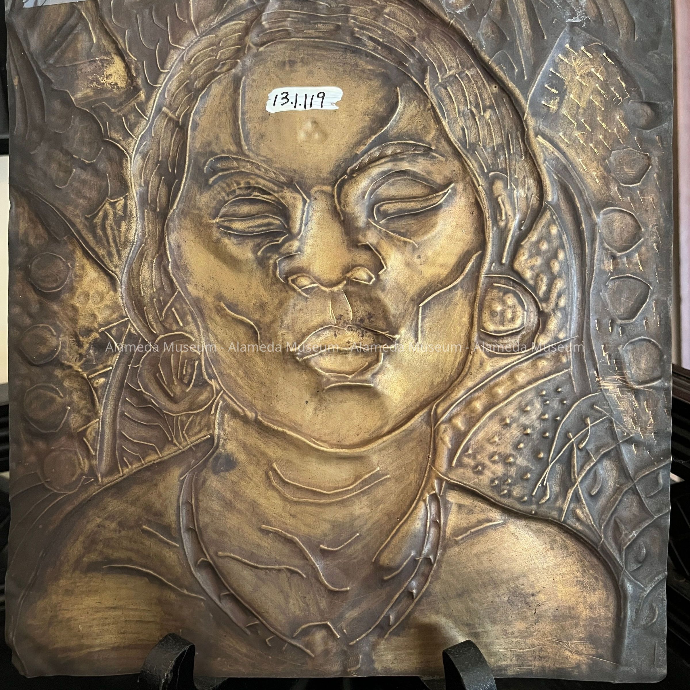 Description: A brass plaque with a patinated finish depicting a female native, possibly of Central or South America. The design appears to have been hand hammered in a stylized design. Maker unknown.