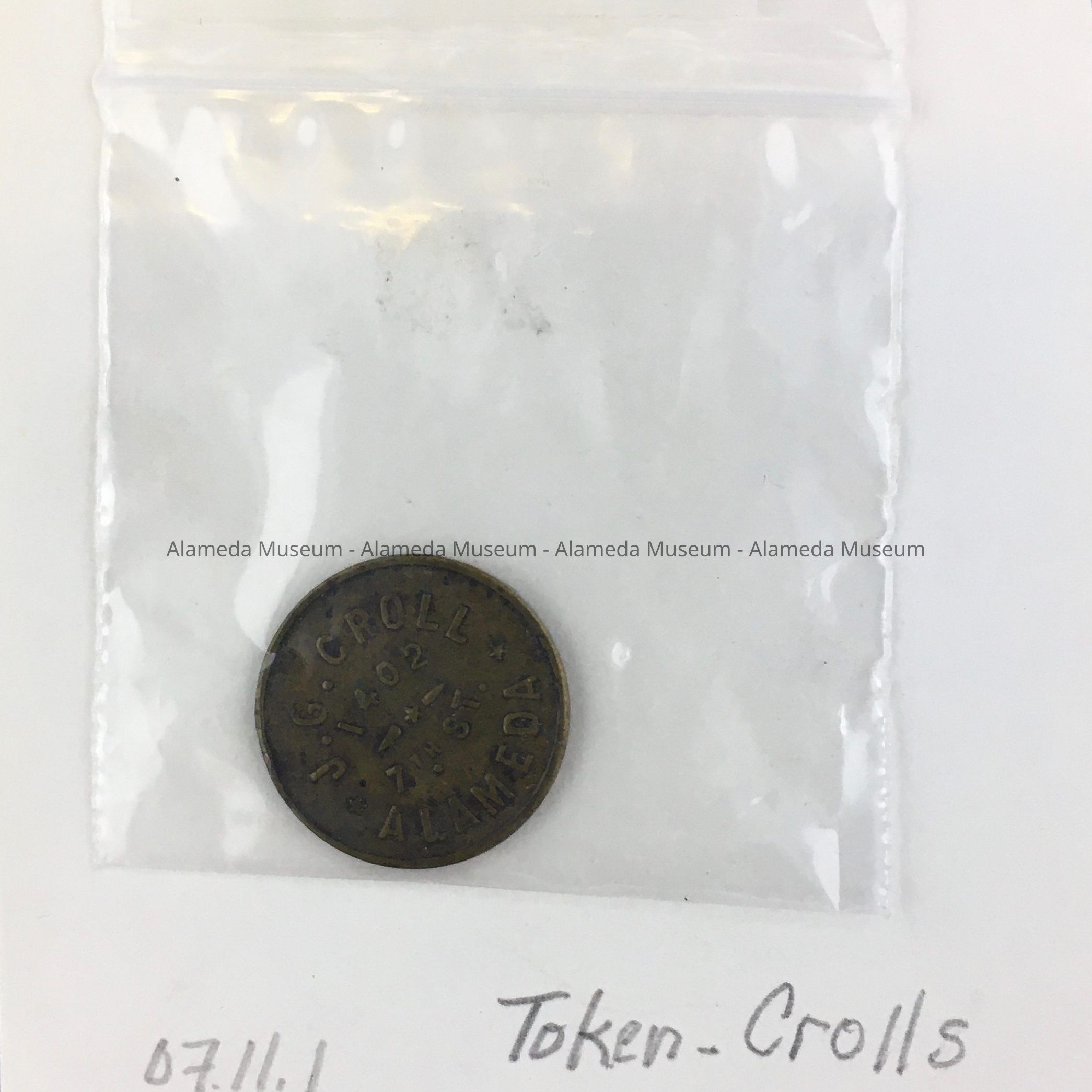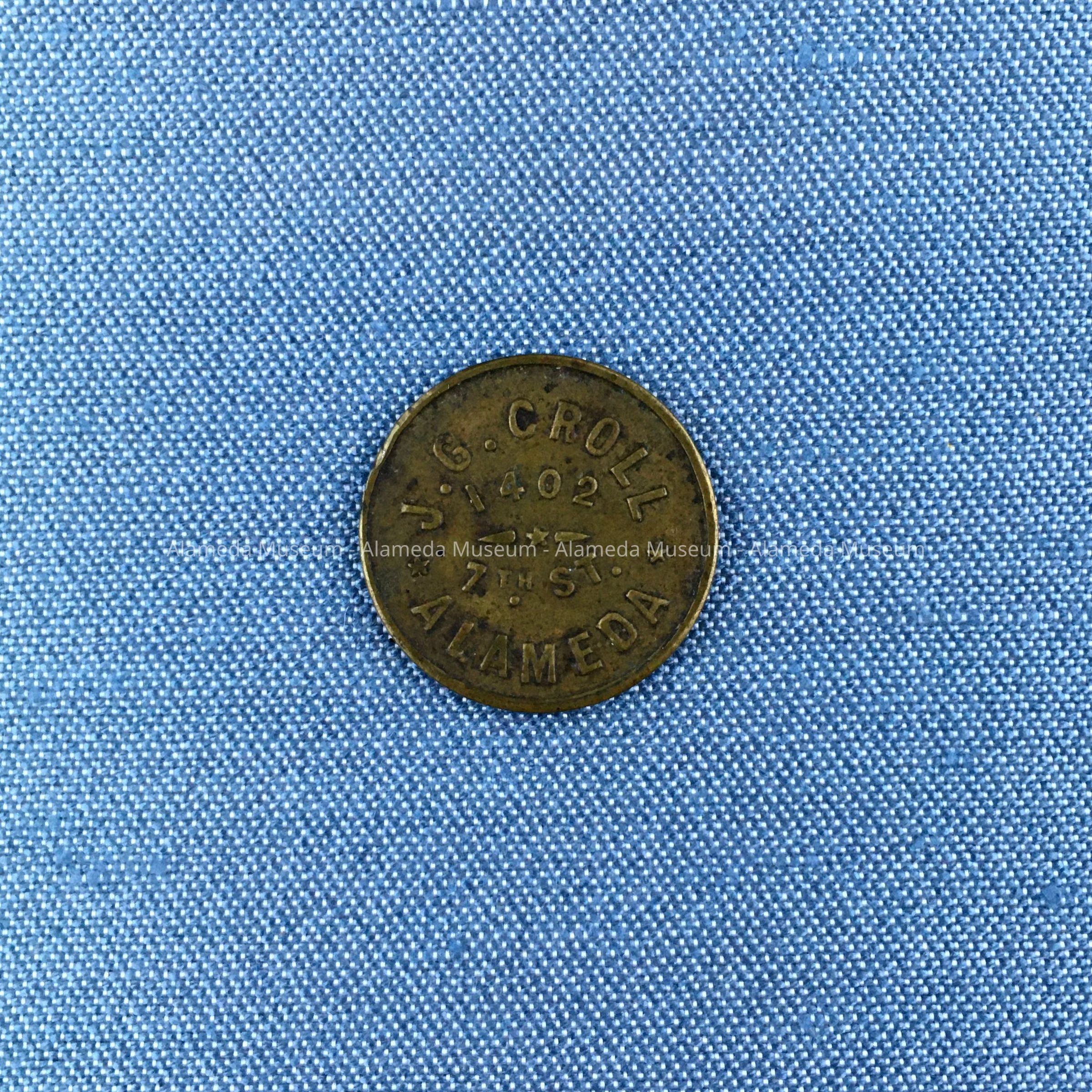 HISTORY OF OBJECT: A BRASS TOKEN. MESSAGE ON ONE SIDE READS, "GOOD FOR 5¢ IN TRADE." REVERSE SIDE STATES, "J. G. CROLL, 1402 7th STREET, ALAMEDA." IN 1890 THE ALAMEDA STREETS, RUNNING FROM NORTH TO SOUTH, WERE NUMBERED "1st through 32nd." A DECISION WAS MADE FOR THE ESTABLISHMENT OF FREE POSTAL DELIVERY SERVICE TO HOMES AND BUSINESSES; HOWEVER, THE STREET NUMBERING SYSTEM WAS UNPOPULAR WITH RESIDENTS.