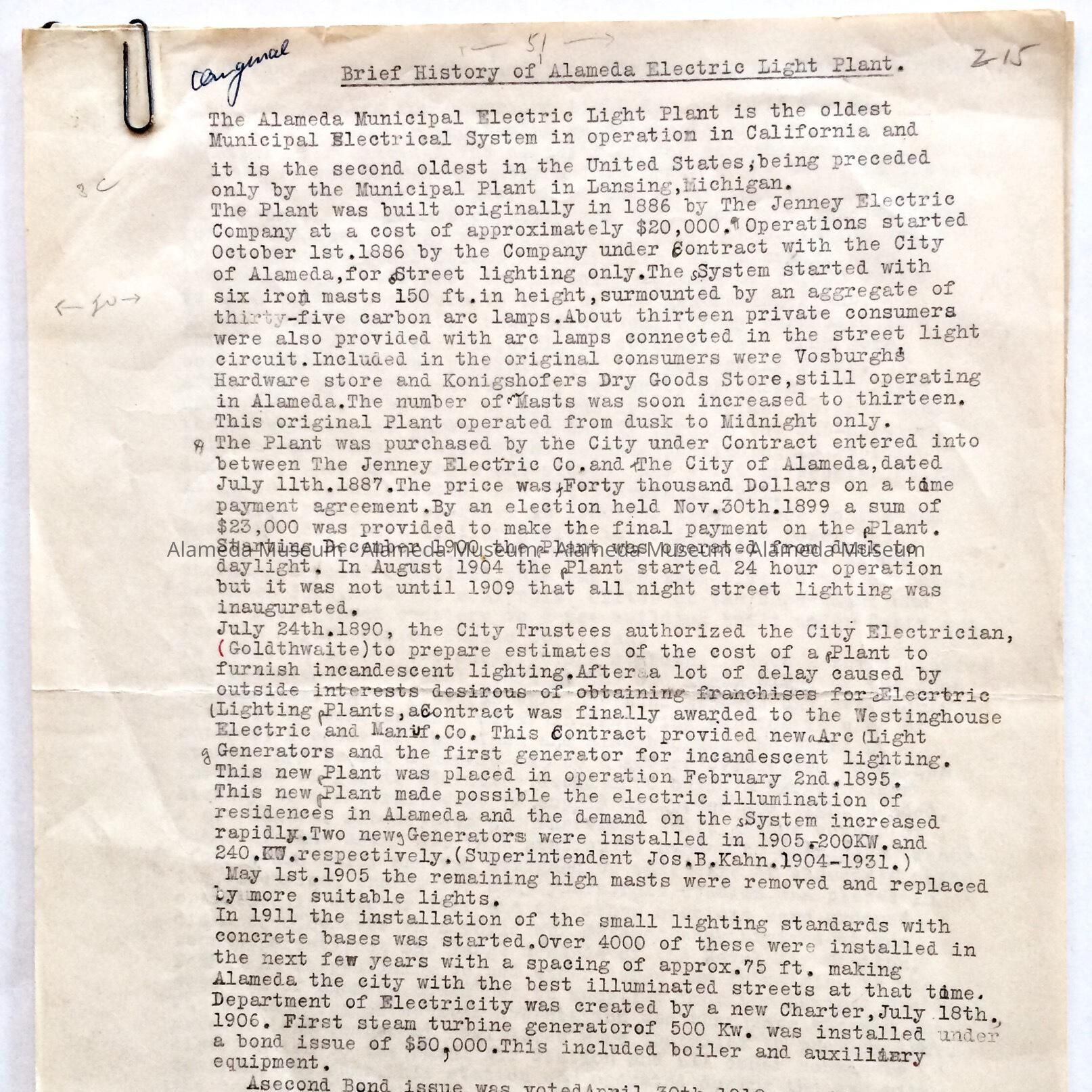 'Brief History of Alameda Electric Light Plant', 1957Entry/Object ID