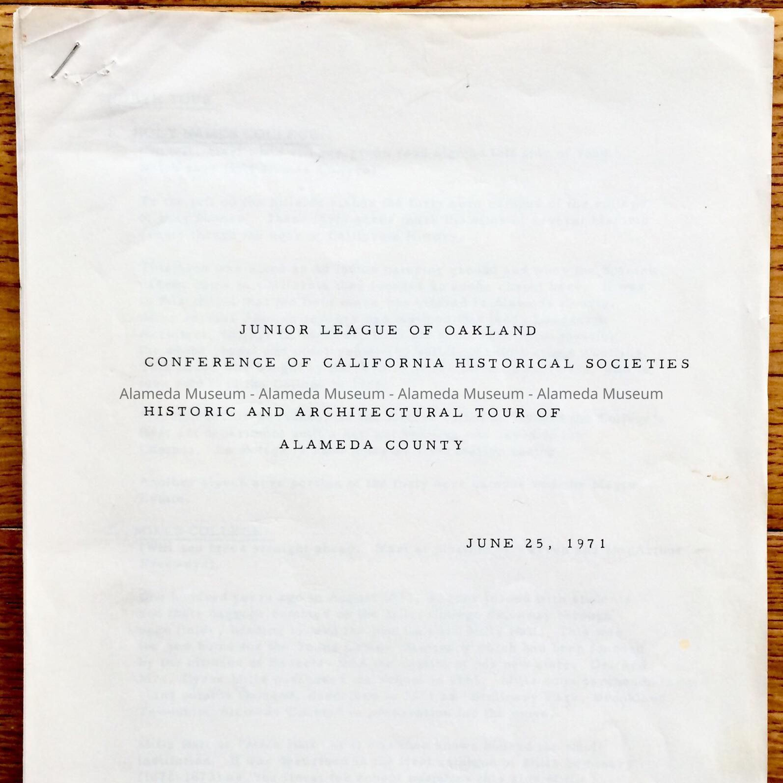 Description: Printed seventeen (17) page publication on white colored paper. Cover page has bold printed caption "Junior League of Oakland Conference of California Historical Societies".
