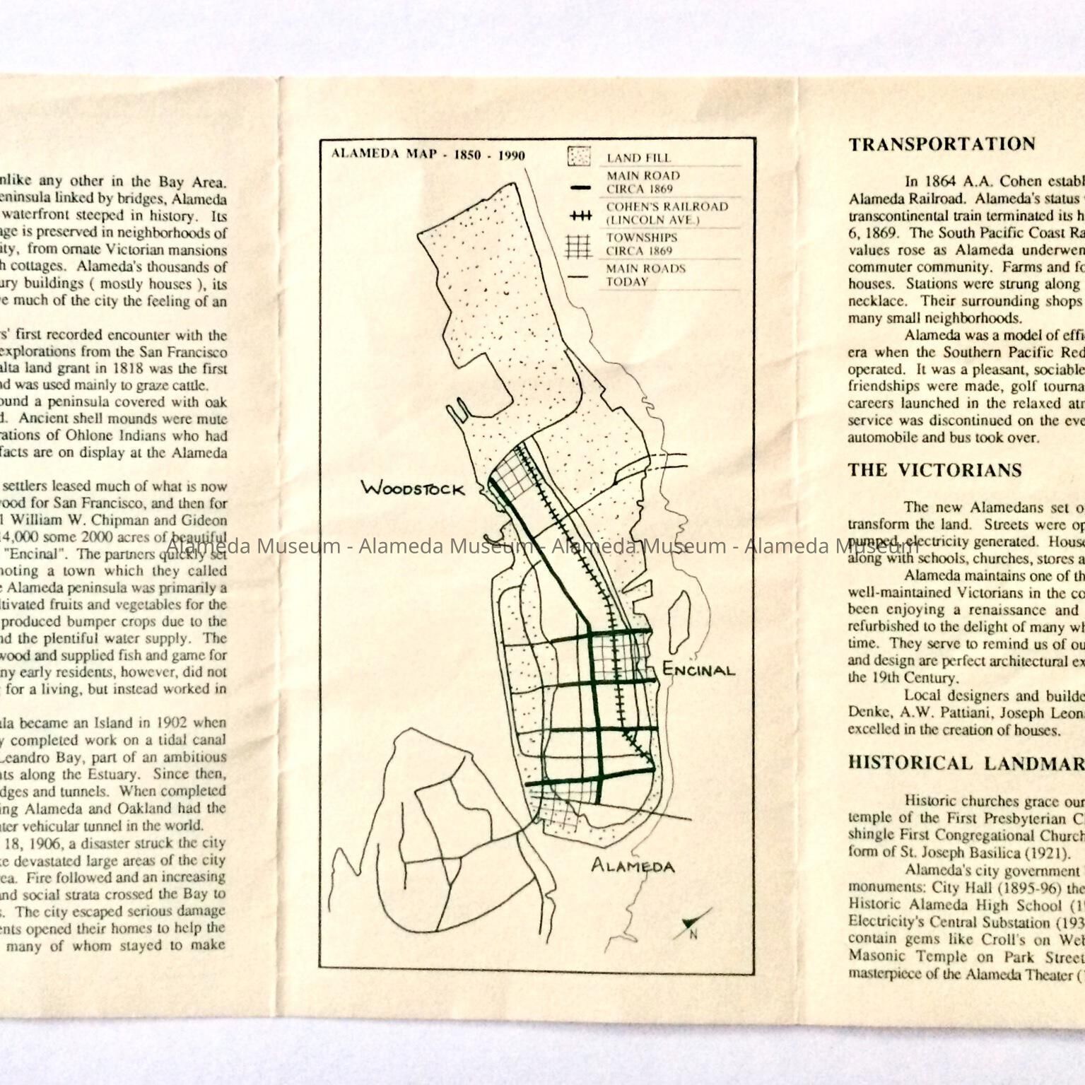 DESCRIPTION: A LEGAL-SIZE PAPER FLYER THAT FOLDS INTO THREE SECTIONS. COVER HAS AN ILLUSTRATION DEPICTING BUILDINGS IN ALAMEDA IN GREEN TYPE ON AN OFF WHITE BACKGROUND.
