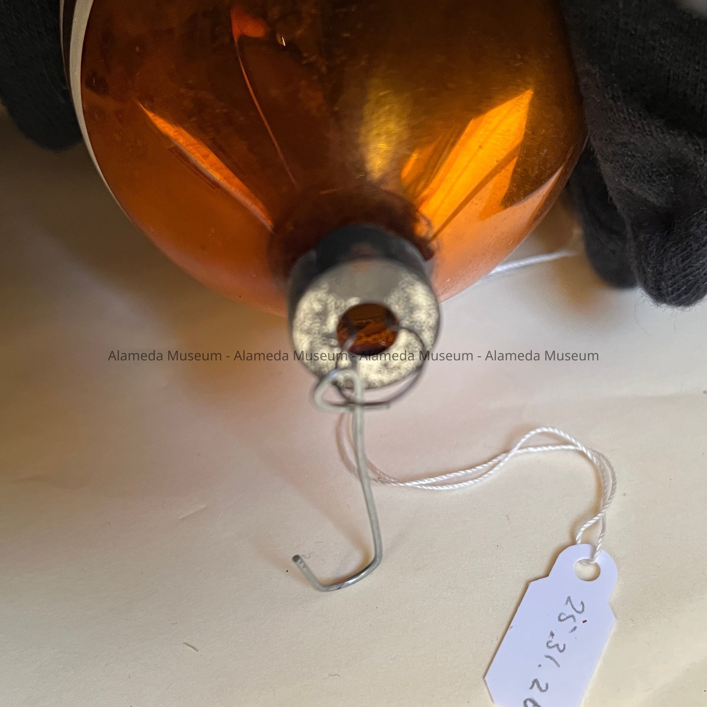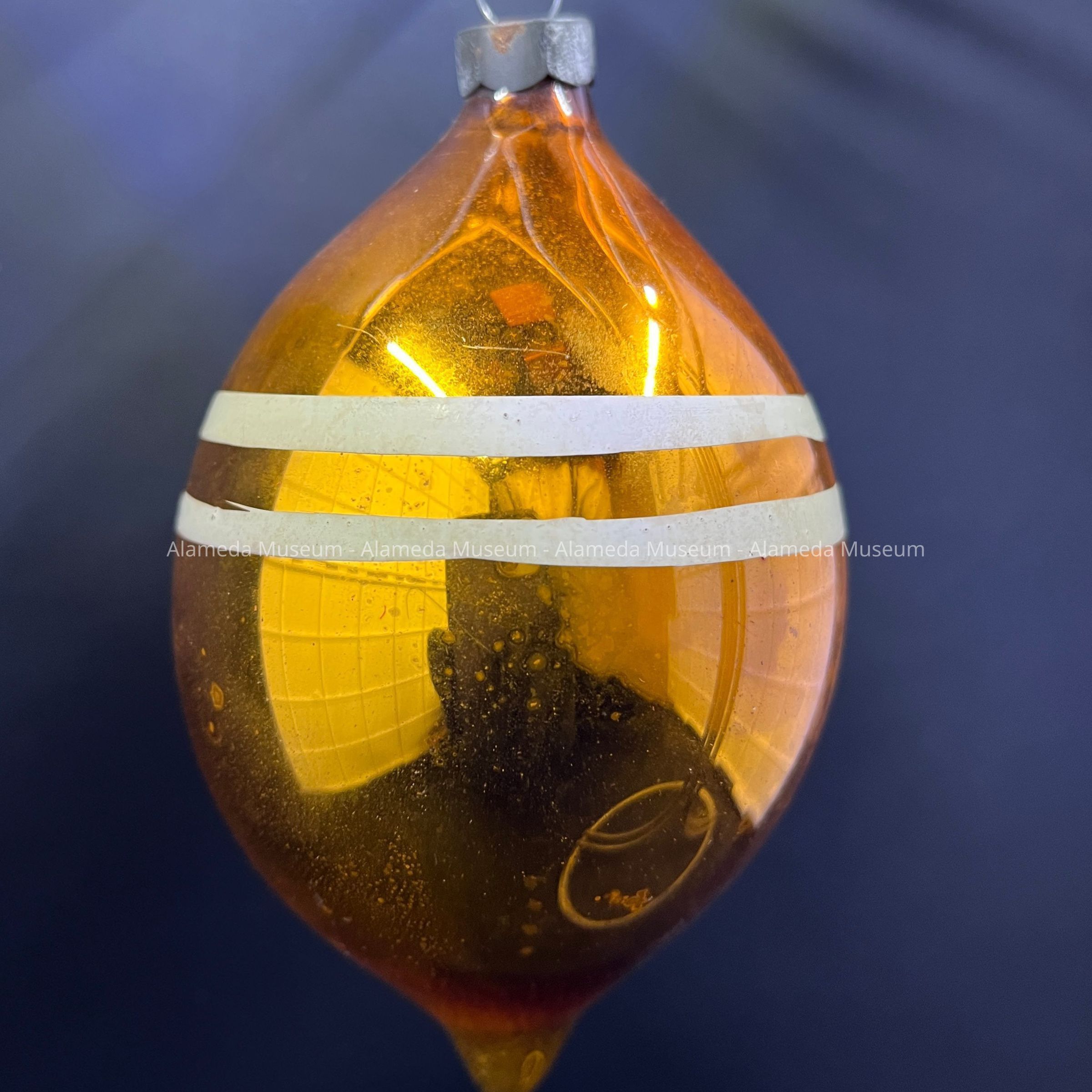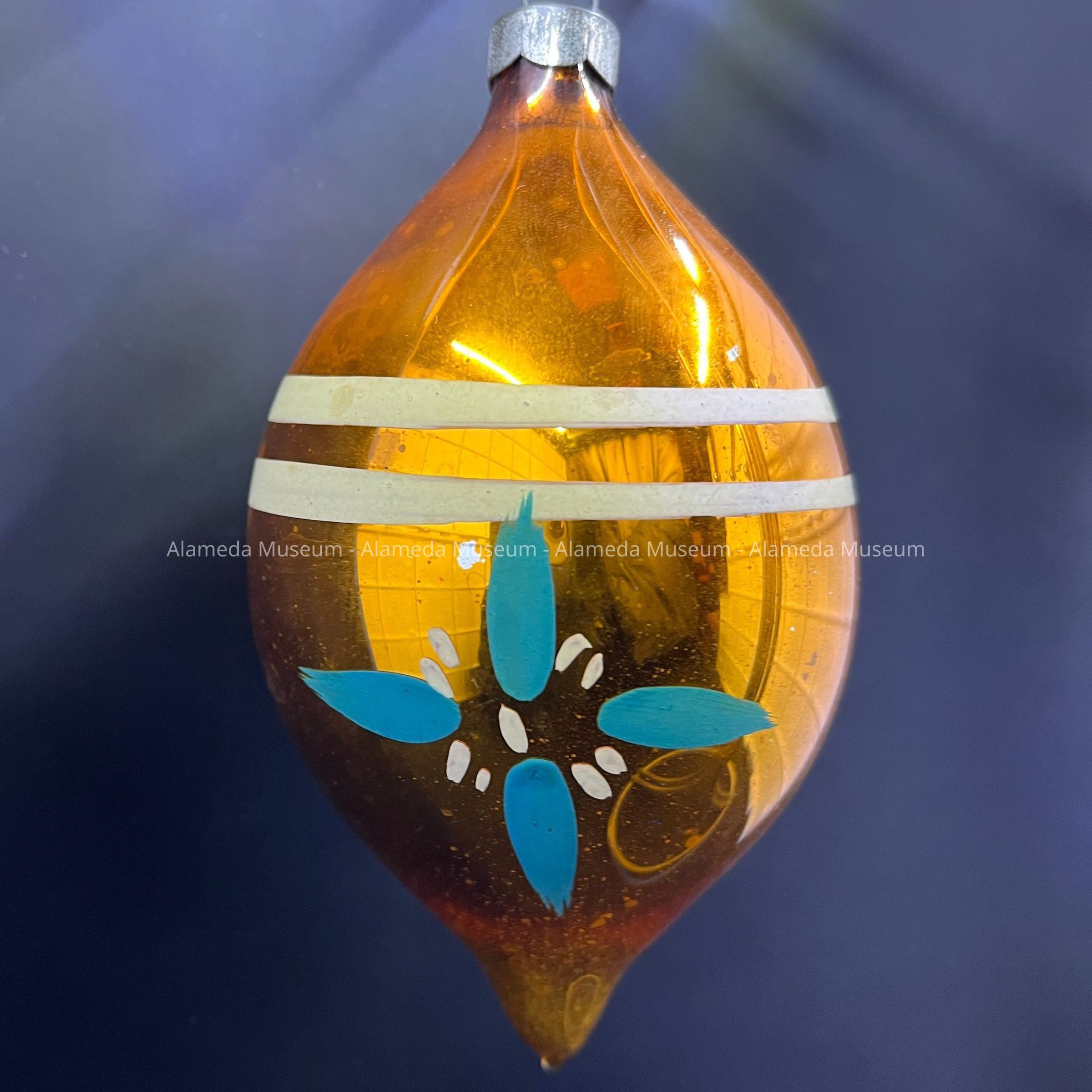 Description: A finial-shaped ornament, base color painted metallic amber, with 2 horizontal opaque white lines on the upper side, and on one side, a painted stylized flower with four blue petals and smaller white dashes. Original cap appears to have imprinted 'Made in U.S. of A' but is corroded.
