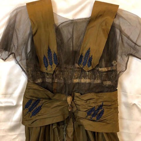 Bronze taffeta dress with blue silk leaf embroidery, c. 1915-1920Entry/Object ID