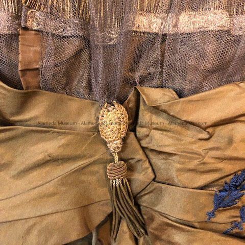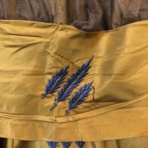 Description: Dress of bronze colored taffeta with embroidered silk (blue) leaf design. Petticoat trimmed with gold braiding repeated at bodice.