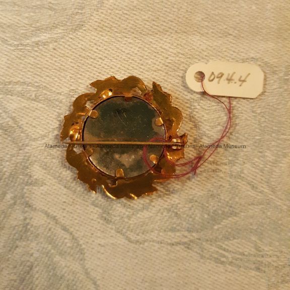 DESCRIPTION: A BROACH, ALSO SPELLED "BROOCH," CONSISTING OF A SEPIA TINTED PHOTO WITH CELLULOID COVER IN CIRCULAR-SHAPED GOLD-PLATED BROACH FRAME AND AN ELABORATE FILIGREE BORDER.
