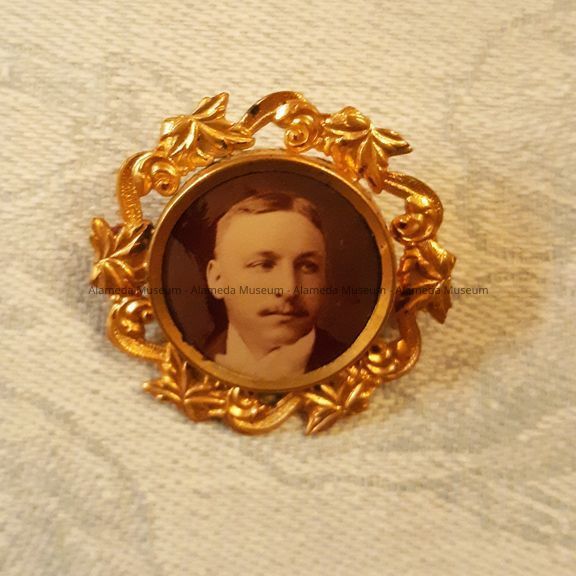 HISTORY OF OBJECT: A PHOTOGRAPHIC BROACH WITH A PHOTOGRAPH OF AN UNIDENTIFIED MEMBER OF THE MEYERS FAMILY. THE GENTLEMAN WORE A MUSTACHE AND IS FORMALLY ATTIRED. THE PHOTOGRAPHED GENTLEMAN MIGHT BE A BROTHER OF MRS. HENRY H. MEYERS.