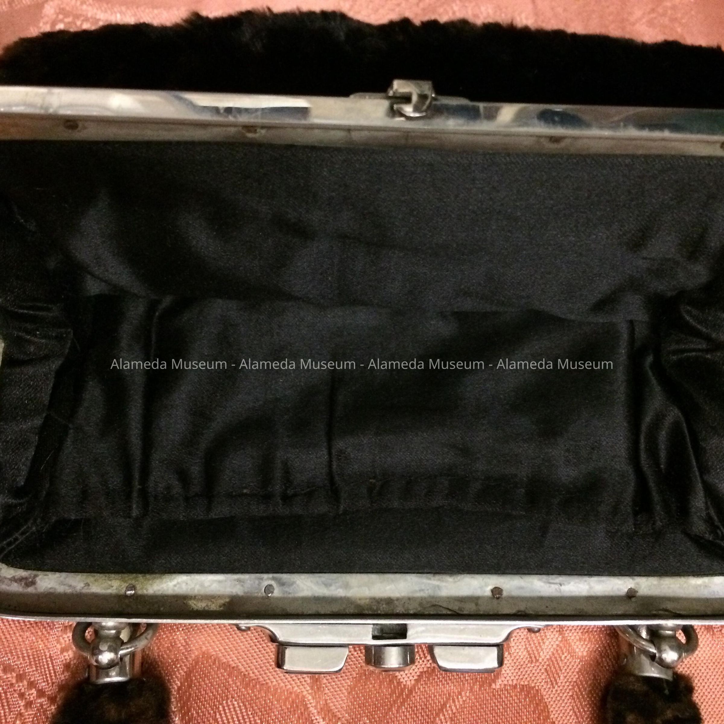 Description: Purse of brown colored beaver with matching handle. Frame and clasp of nickel plated brass. Lining is brown colored satin.