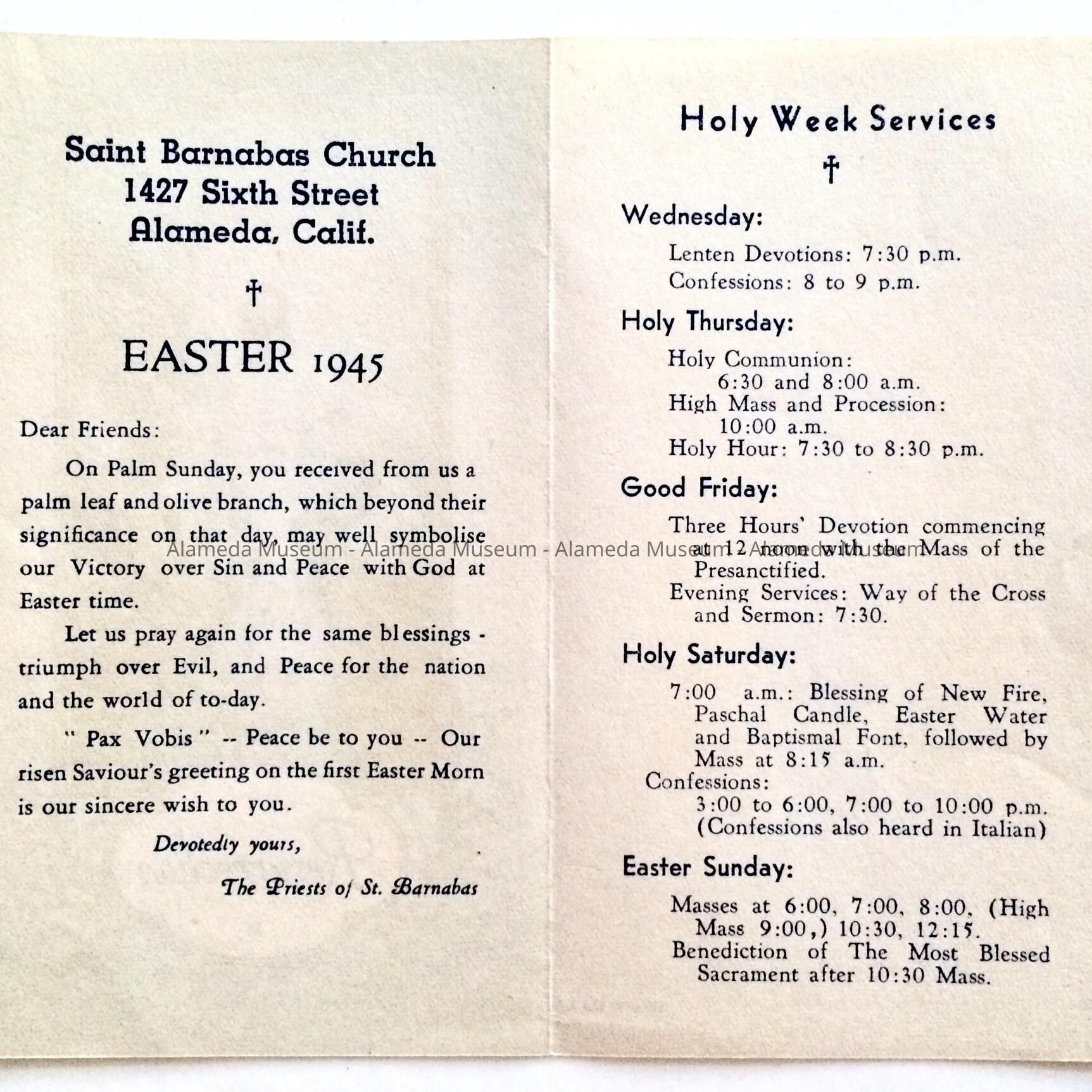 HISTORY OF OBJECT: A SCHEDULE DATED 1945, FOR HOLY WEEK SERVICES AT SAINT BARNABAS CATHOLIC CHURCH, 1427 SIXTH STREET, ALAMEDA.