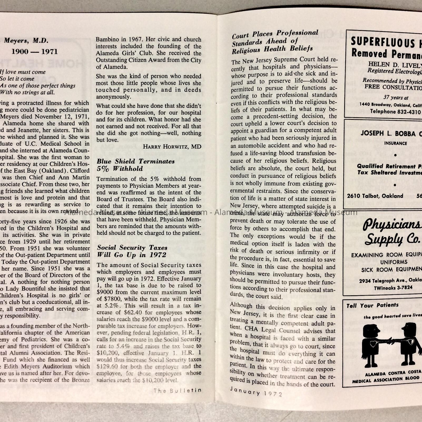 HISTORY OF OBJECT: A BOOKLET BULLETIN ISSUED JANUARY 1972 FROM THE ALAMEDA CONTRA COSTA MEDICAL ASSOCIATION. INCLUDED IS AN OBITUARY CONCERNING DR. EDITH MEYERS, MD.