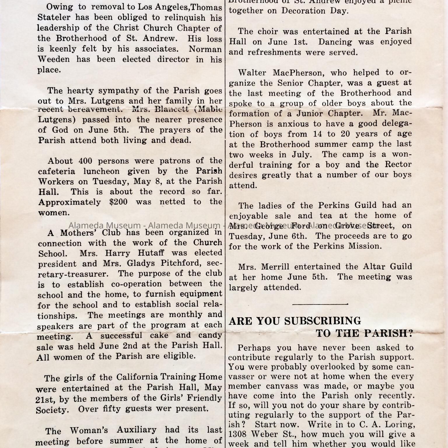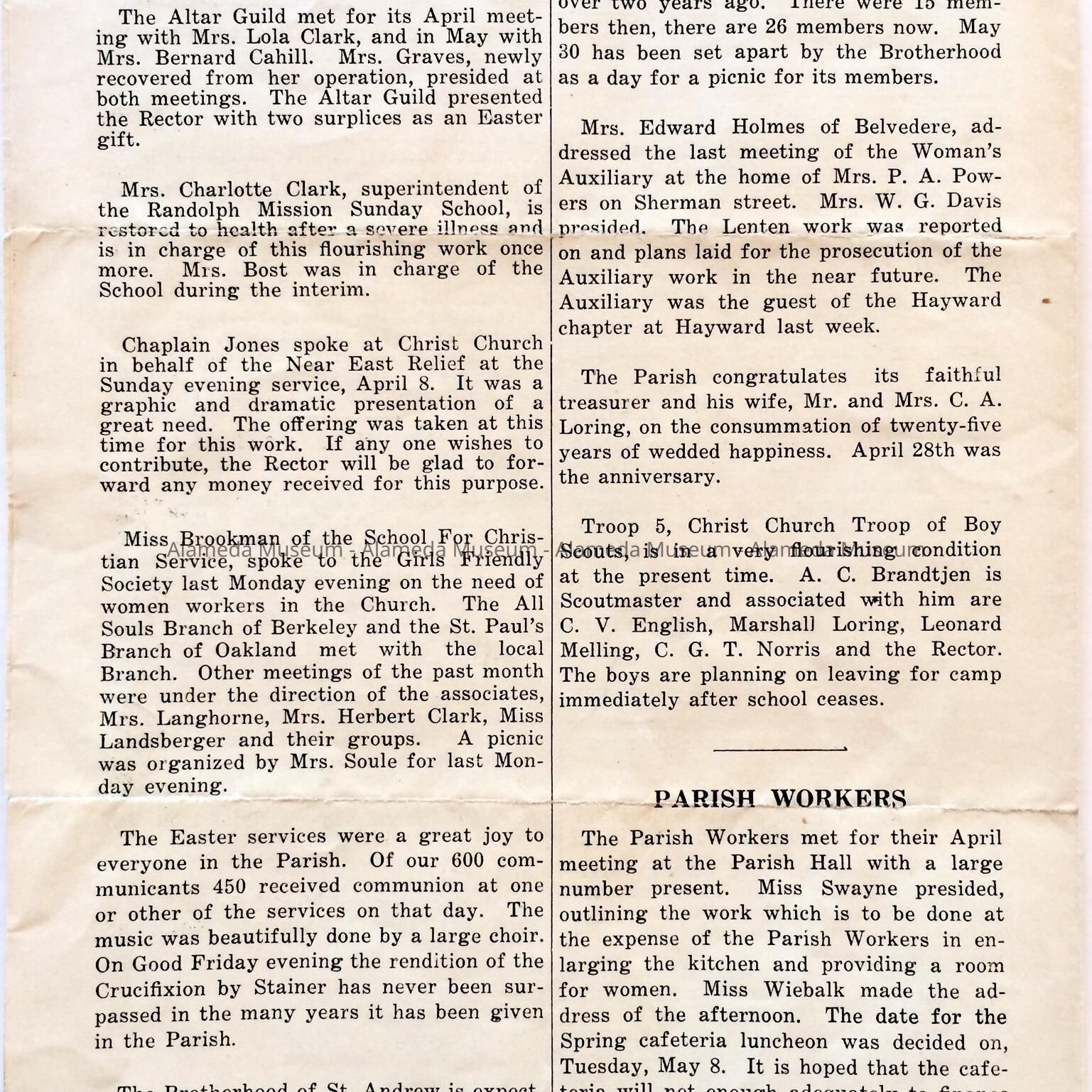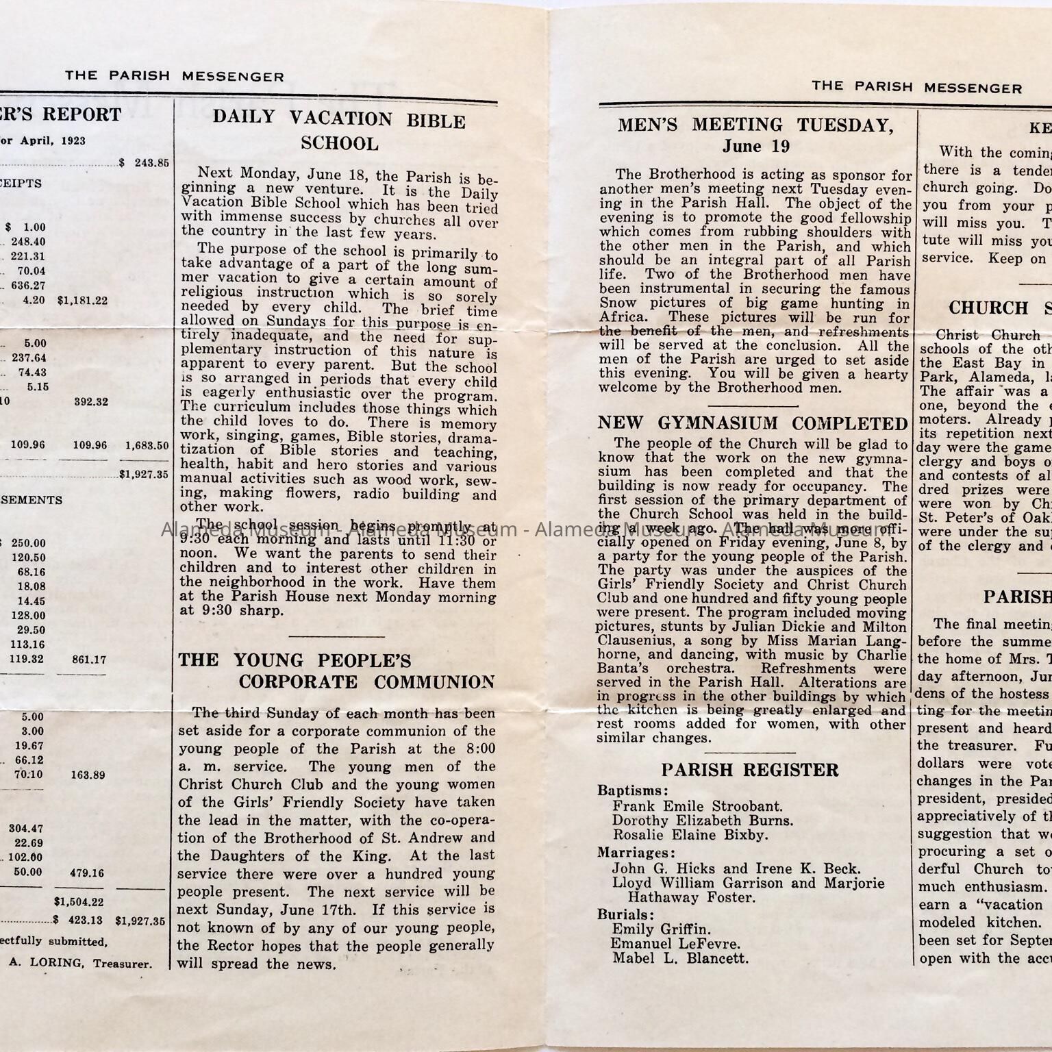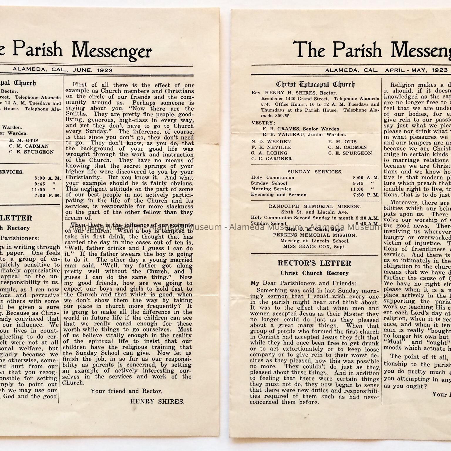 BULLETIN FOR CHRIST EPISCOPAL CHURCH, ALAMEDA, CA, DATED APRIL, MAY, AND JUNE OF 1923.