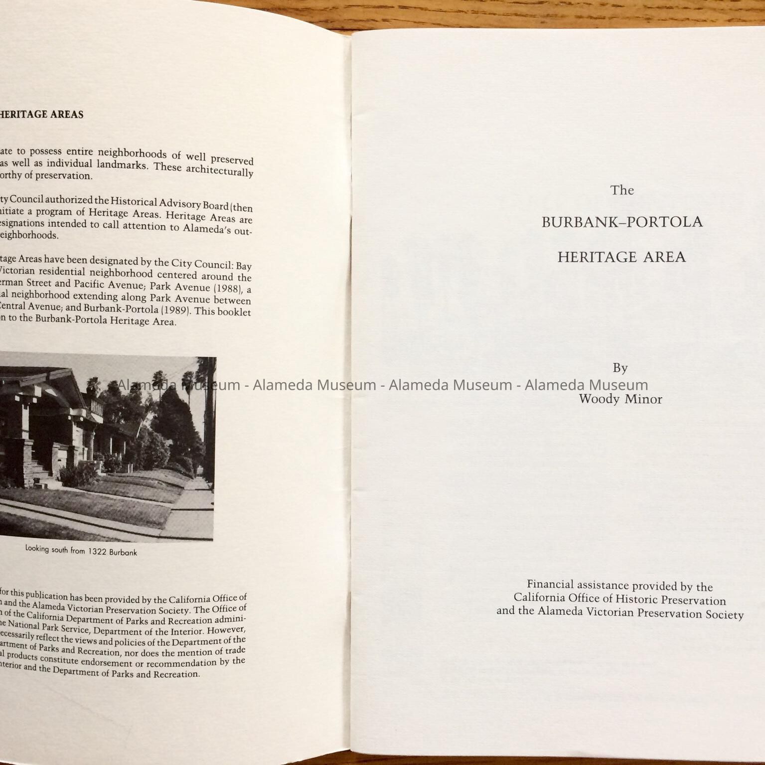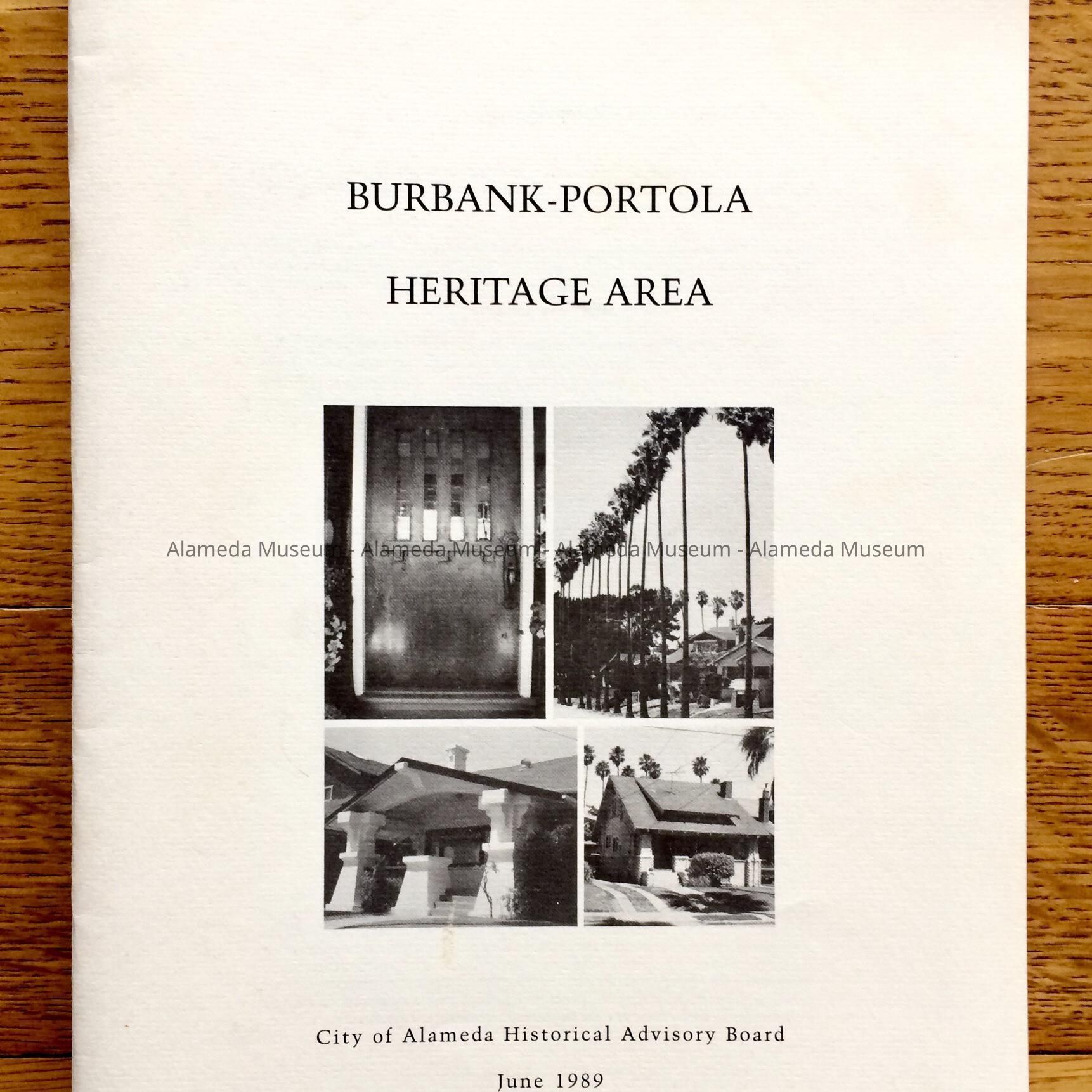 Description: Soft cover booklet with cover design featuring four (4) black and white photographic illustrations. Bold printed caption “Burbank-Portola Heritage Area” in black colored type on a white colored background.
