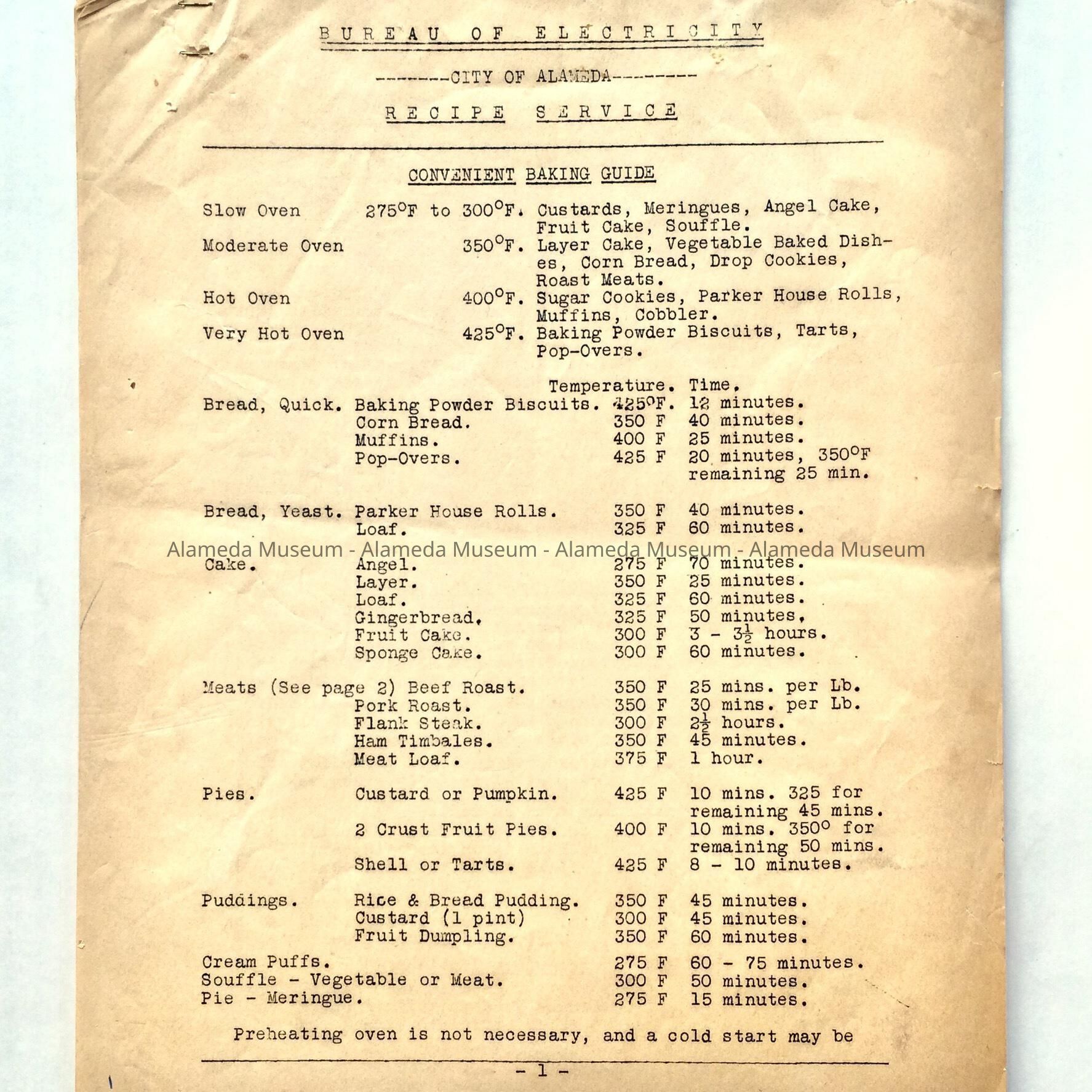 History of Object: Eight-page booklet of recipes compiled by the Bureau of Electricity of Alameda. The booklet was possibly issued during the period when the Bureau sold electric appliances at its office and showrooms at Santa Clara Avenue and Everett Street.