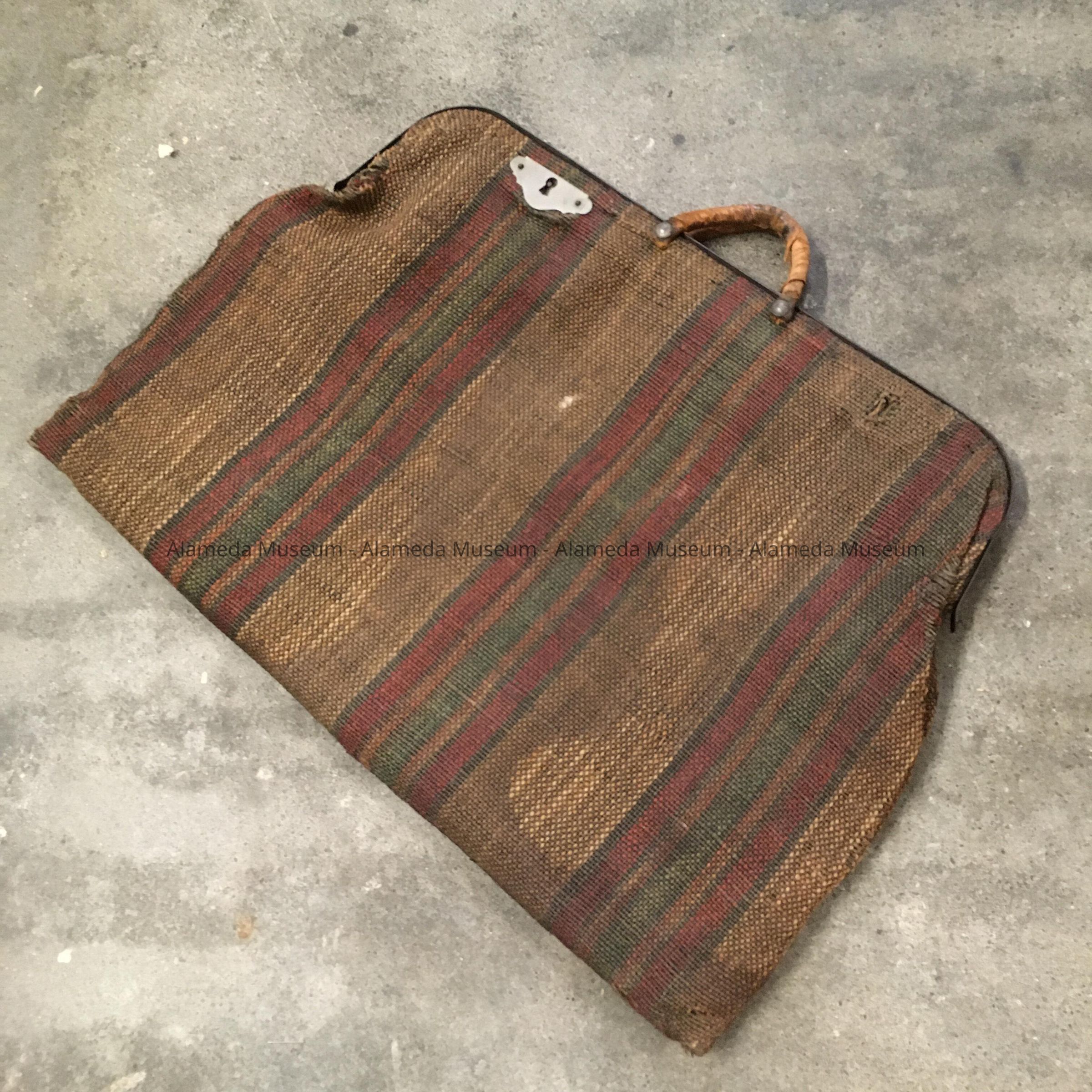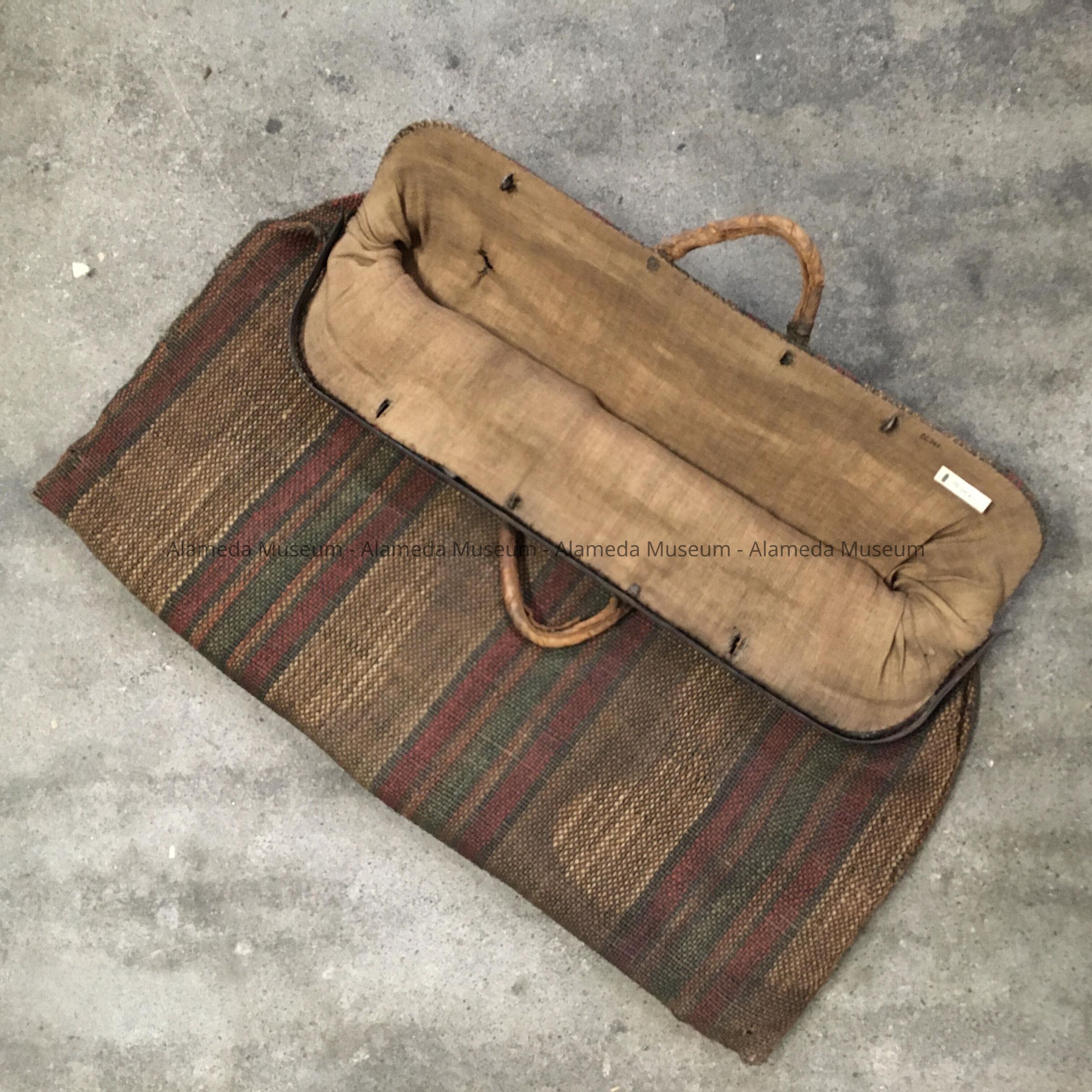 History of Object: Burlap covered bag that was used by Conrad Roth (contractor & builder of Alameda) to carry his finishing tools in.