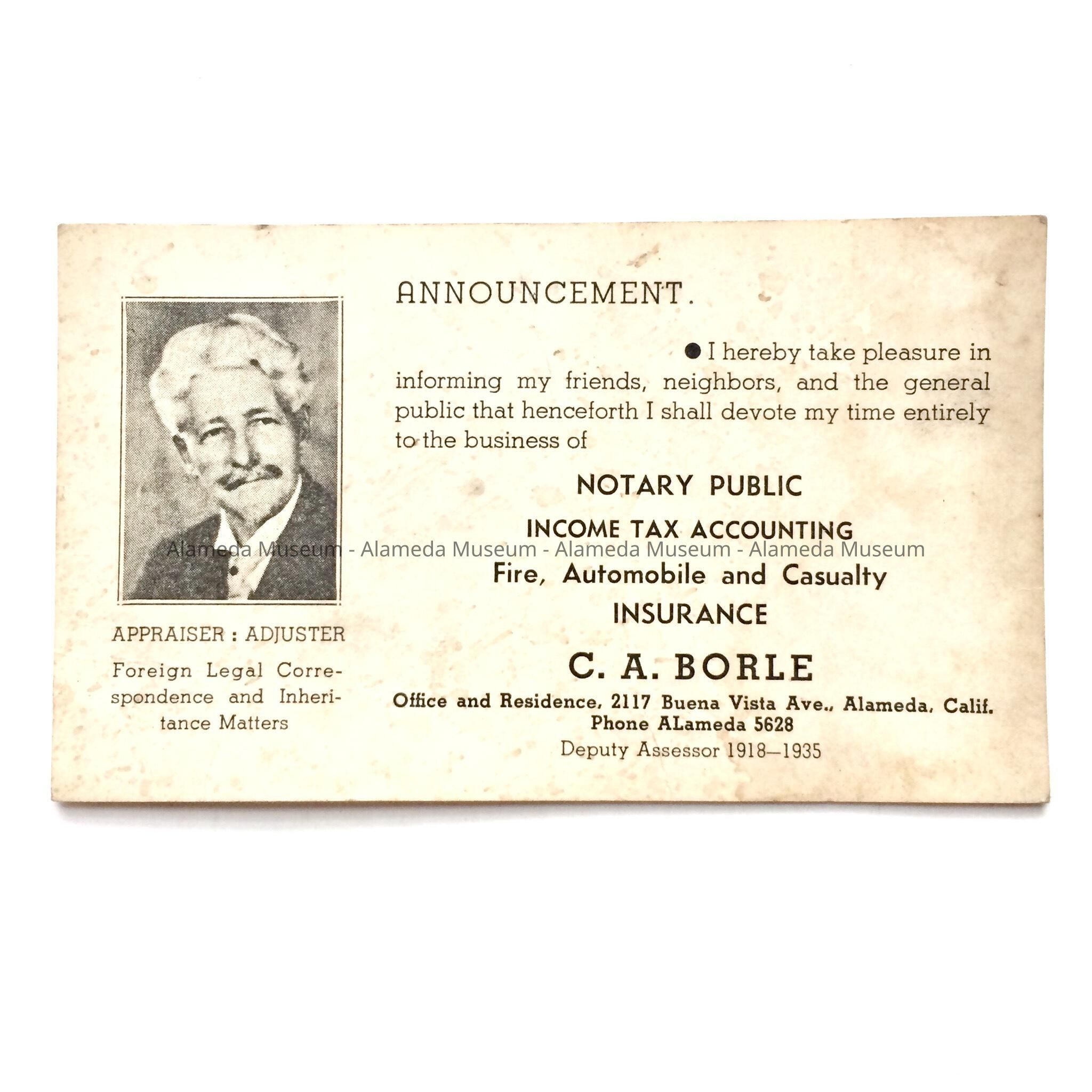 BUSINESS ANNOUNCEMENT OF THE NOTARY PUBLIC, INSURANCE BUSINESS OF C. A. BORLE, OFFICE AND RESIDENCE, 2117 BUENA VISTA AVENUE, ALAMEDA, CA. MR BORLE WAS DEPUTY ASSESSOR FROM 1918 TO 1935.