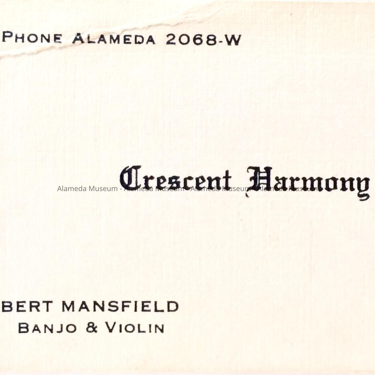 BUSINESS CARD FOR THE CRESCENT HARMONY FOUR, A DANCE ORCHESTRA. THE CARD ALSO INCLUDES THE NAME OF BERT MANSFIELD, BANJO AND VIOLIN. HE WAS A MEMBER OF THE BAND AT 2020 CLINTON AVENUE, ALAMEDA, CALIFORNIA.